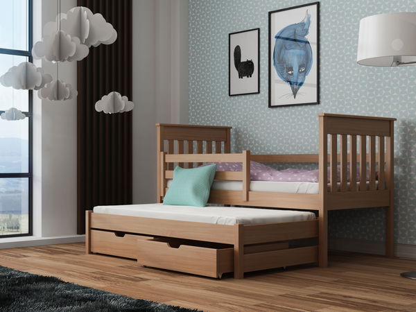 Rozkládací postel Toya je nižší postel určena zejména pro děti, například pro dva sourozence. Postel je zvlášť vhodná pro malé děti. Horní lůžko má okolo rámu bariéry. Bariéry chrání dítě před vypadnutím z postele. Bariéry je možné kdykoliv odmontovat. Spodní lůžko je umístěno pod horním a dá se jednoduše vytáhnout a připravit na spaní. Postel nezabírá mnoho místa a hodí se do menších dětských pokojů. K dispozici je i praktický úložný prostor, kam si můžete uložit ložní prádlo nebo hračky.