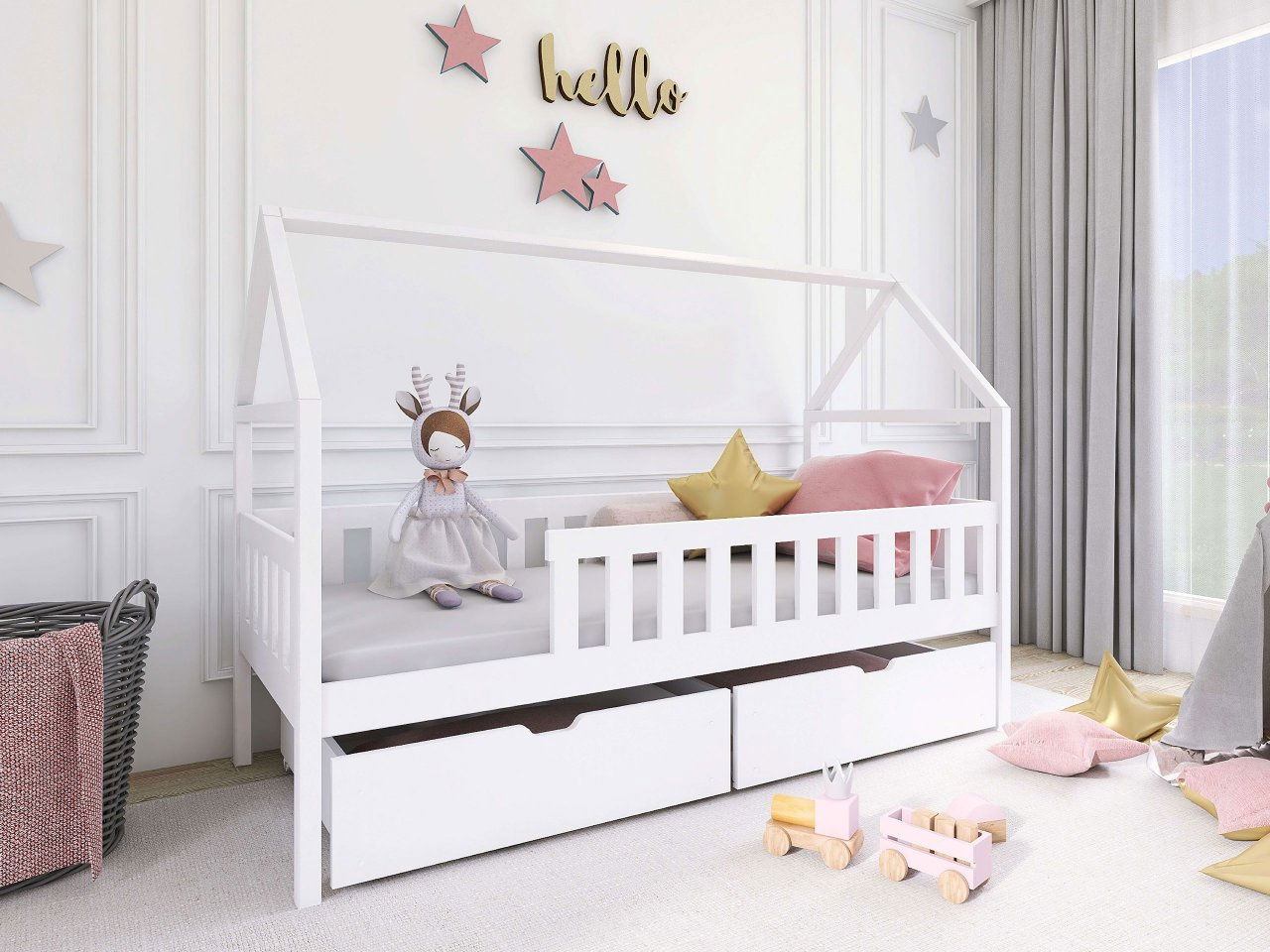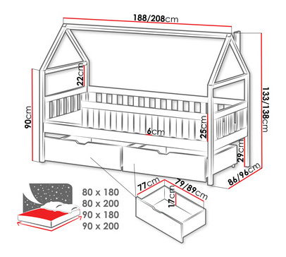 Dětská postel je ideální volbou pro ty, kteří hledají pohodlí a styl. Dětská postel Jundia se šuplíky je dokonalým řešením do pokojíčku vašeho batolete! Jedinečný design ve tvaru domu z něj činí nejen místo ke spaní, ale i prostor pro hraní a rozvíjení fantazie. Pevné zábradlí zajišťuje bezpečnost proti pádu během spánku. Postel má pod sebou prostorné zásuvky. Jedná se o další prostor v dětském pokoji pro odkládání hraček, ložního prádla nebo oblečení. Přidejte trochu kouzla do každodenního života vašeho dítěte s dětskou postelí Jundia! Rozměry: 80 x 180: délka: 188 cm, šířka: 86 cm, výška: 133 cm, plocha na spaní: 80 x 180 cm, rozměry úložného prostoru (jedna zásuvka): délka: 79 cm, šířka: 77 cm, výška 17 cm, 80 x 200: 138 cm, plocha na spaní: 80 x 200 cm, rozměry úložného prostoru (jedna zásuvka): délka: 89 cm, šířka: 77 cm, výška 17 cm, 90 x 180: délka: 188 cm, šířka: 96 cm, výška: 133 cm, plocha na spaní: 9 zásuvka): délka: 79 cm, šířka: 77 cm, výška 17 cm, 90 x 200: délka: 208 cm, šířka: 96 cm, výška: 138 cm, plocha na spaní: 90 x 200 cm, rozměry úložného prostoru (jedna zásuvka): délka: 89 cm, šířka konstrukce z borovicového dřeva, netoxické barvy, certifikováno podle EN 71-3:2019, surovina je 100% certifikovaná FSC, kompletní rošt na matraci FLEX, vyrobený z březového dřeva, zábradlí postele je univerzální - stranu (levá/pravá) si zákazník volí při montáži, čtverc0 úložný prostor ve formě dvou zásuvek s gumovými kolečky H-30, rozměry matrace (80 x 180, 80 x 200, 90 x 180, 90 x 200) - nejsou součástí sady, lze upravit a dokoupit z nabídky Záruka: 24 měsíců
