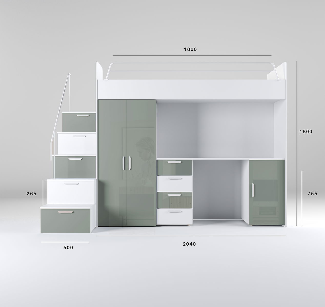 Velmi praktický set do dětského pokoje, kterého součástí je dětská postel, PC stolek, skříň a schody. Ideální i do menších interiérů. Vyrobeno z kvalitní MDF desky, s dvířky a zásuvkami pokrytými akrylovou lakovanou fólií s tloušťkou 0,8 mm.