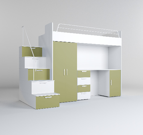 Velmi praktický set do dětského pokoje, kterého součástí je dětská postel, PC stolek, skříň a schody. Ideální i do menších interiérů. Vyrobeno z kvalitní MDF desky, s dvířky a zásuvkami pokrytými akrylovou lakovanou fólií s tloušťkou 0,8 mm.