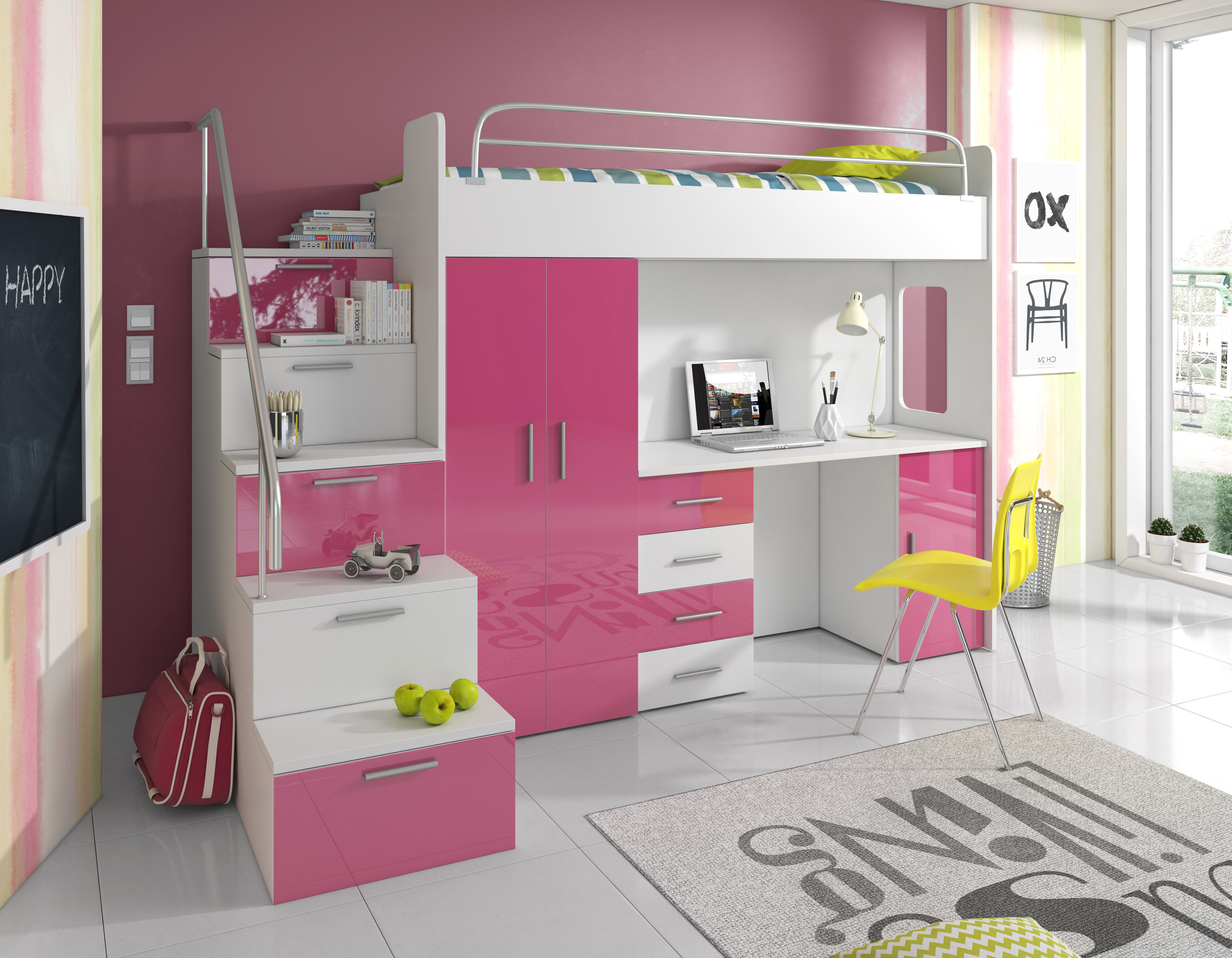 Velmi praktický set do dětského pokoje, kterého součástí je dětská postel, PC stolek, skříň a schody. Ideální i do menších interiérů. Vyrobeno z kvalitní MDF desky, s dvířky a zásuvkami pokrytými akrylovou lakovanou fólií s tloušťkou 0,8 mm.