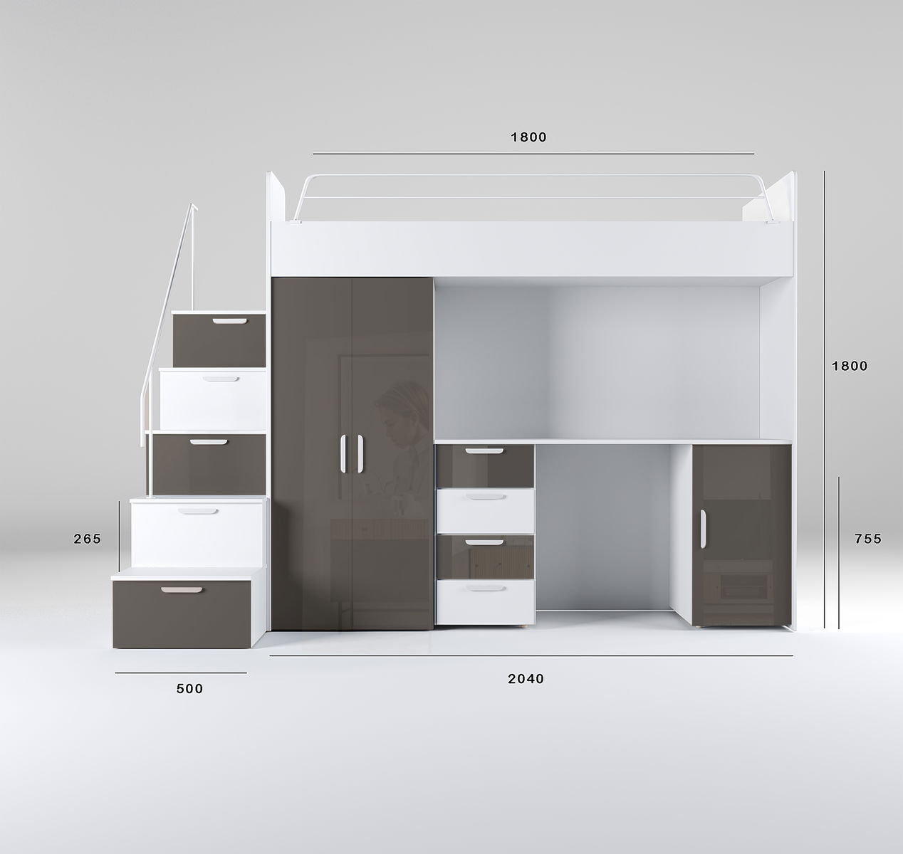 Velmi praktický set do dětského pokoje, kterého součástí je dětská postel, PC stolek, skříň a schody. Ideální i do menších interiérů. Vyrobeno z kvalitní MDF desky, s dvířky a zásuvkami pokrytými akrylovou lakovanou fólií s tloušťkou 0,8 mm.