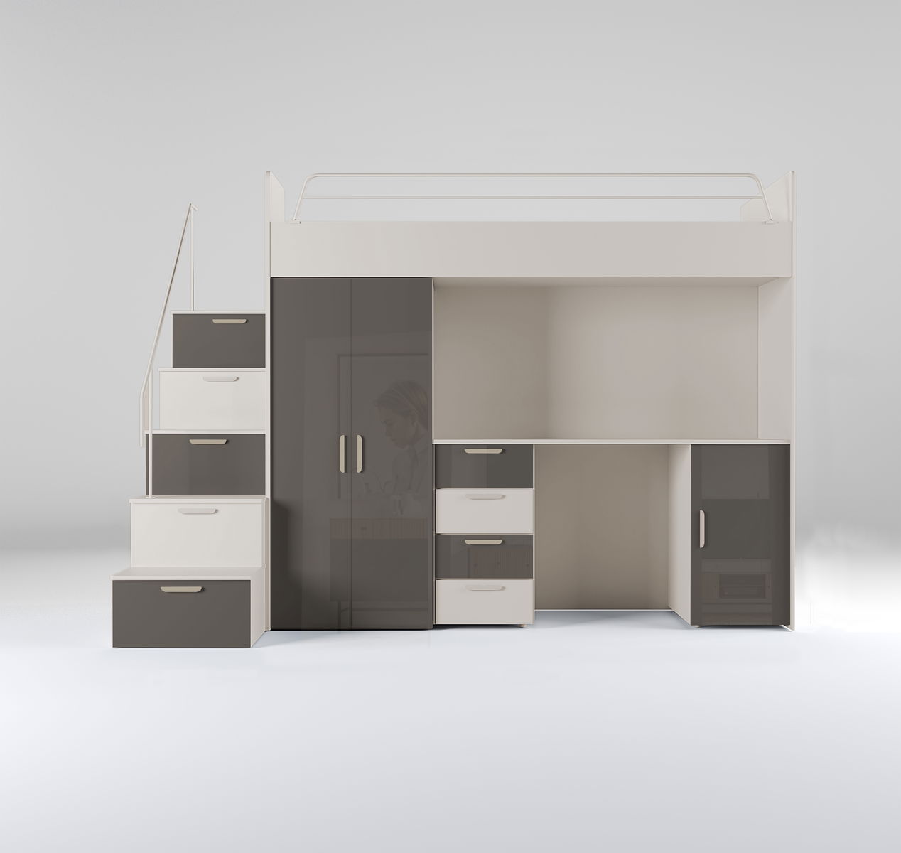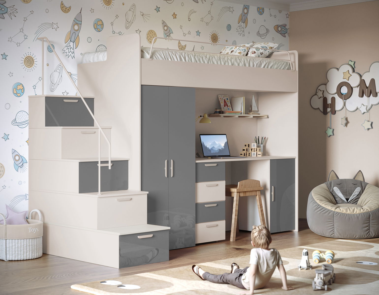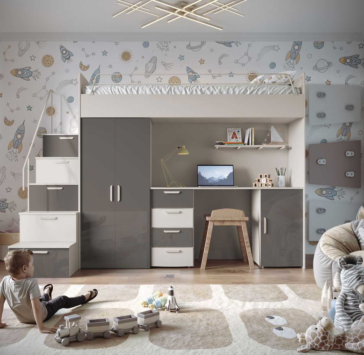 Velmi praktický set do dětského pokoje, kterého součástí je dětská postel, PC stolek, skříň a schody. Ideální i do menších interiérů. Vyrobeno z kvalitní MDF desky, s dvířky a zásuvkami pokrytými akrylovou lakovanou fólií s tloušťkou 0,8 mm.