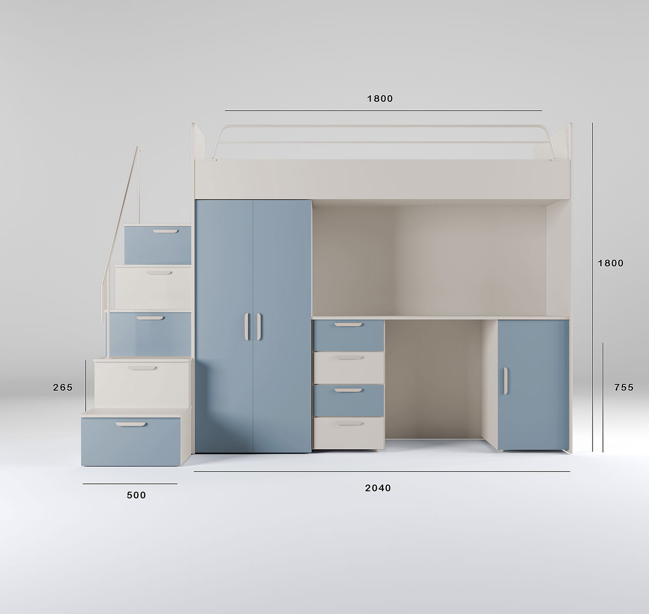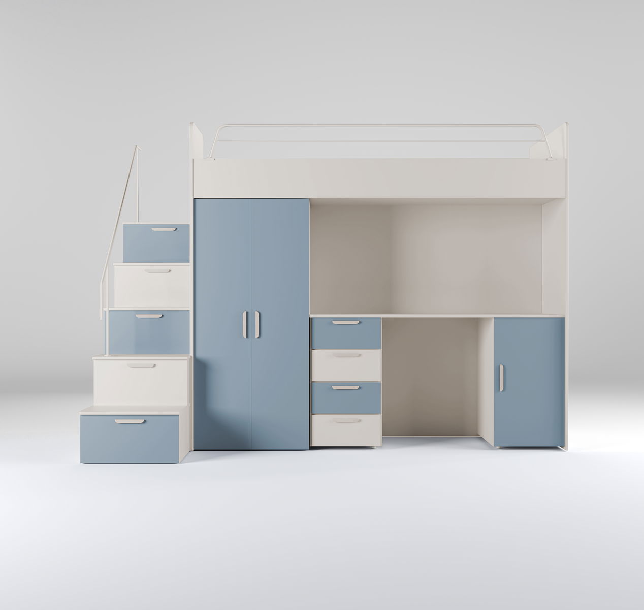 Velmi praktický set do dětského pokoje, kterého součástí je dětská postel, PC stolek, skříň a schody. Ideální i do menších interiérů. Vyrobeno z kvalitní MDF desky, s dvířky a zásuvkami pokrytými akrylovou lakovanou fólií s tloušťkou 0,8 mm.