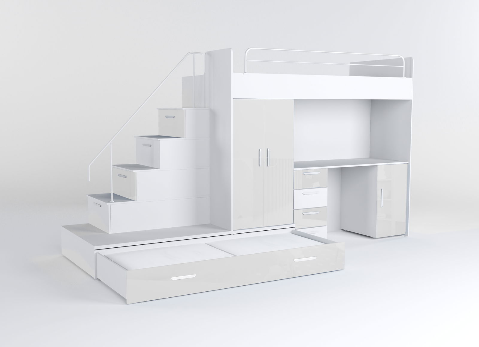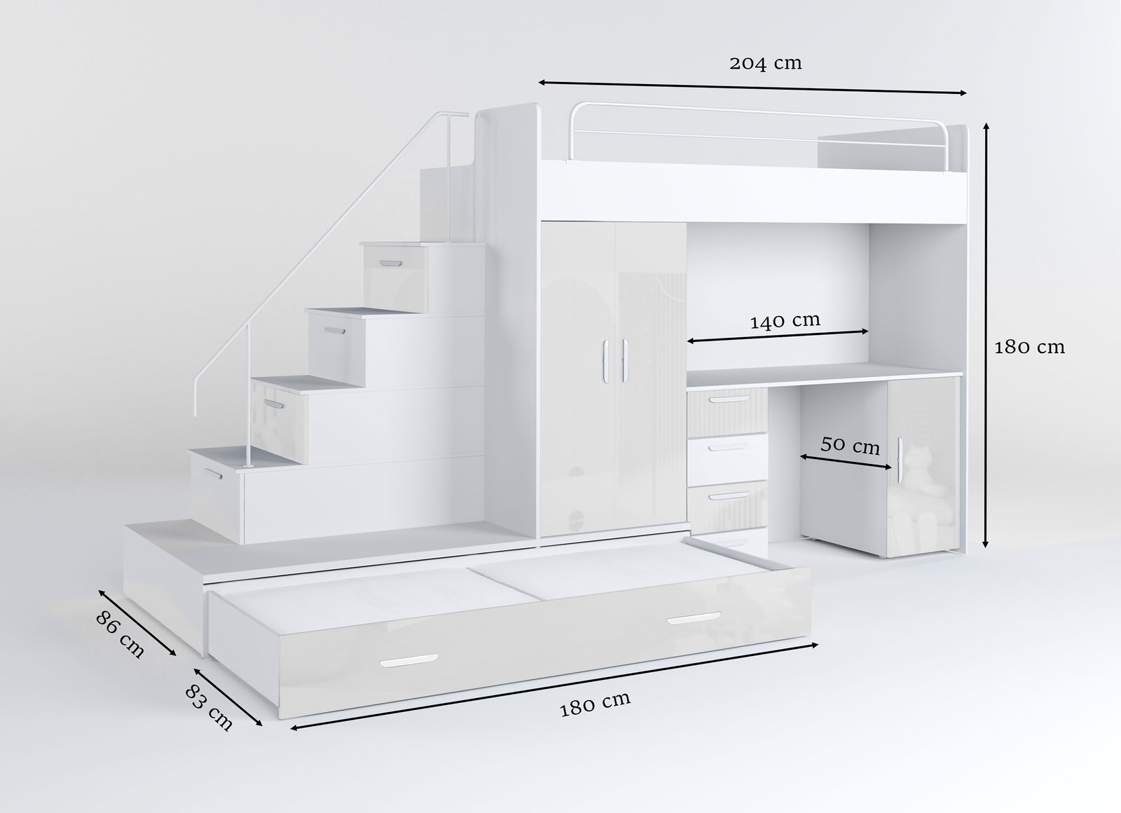 Velmi praktický set do dětského pokoje, kterého součástí je dětská postel, PC stolek, skříň a schody. Ideální i do menších interiérů. Vyrobeno z kvalitní MDF desky, s dvířky a zásuvkami pokrytými akrylovou lakovanou fólií s tloušťkou 0,8 mm.