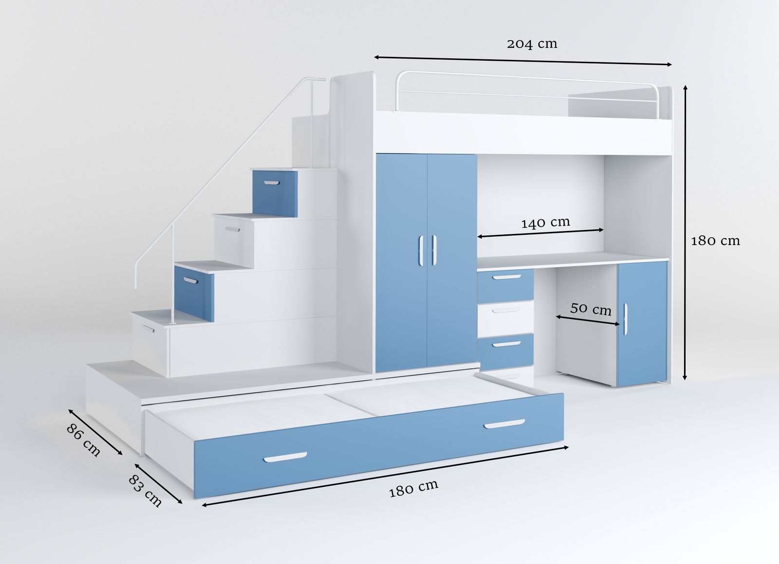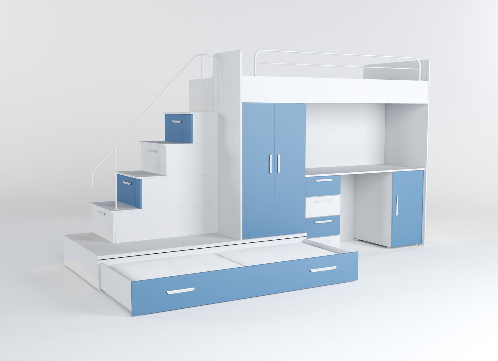 Velmi praktický set do dětského pokoje, kterého součástí je dětská postel, PC stolek, skříň a schody. Ideální i do menších interiérů. Vyrobeno z kvalitní MDF desky, s dvířky a zásuvkami pokrytými akrylovou lakovanou fólií s tloušťkou 0,8 mm.