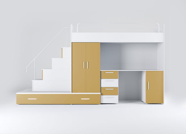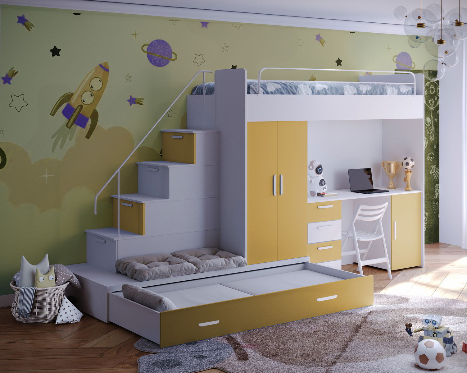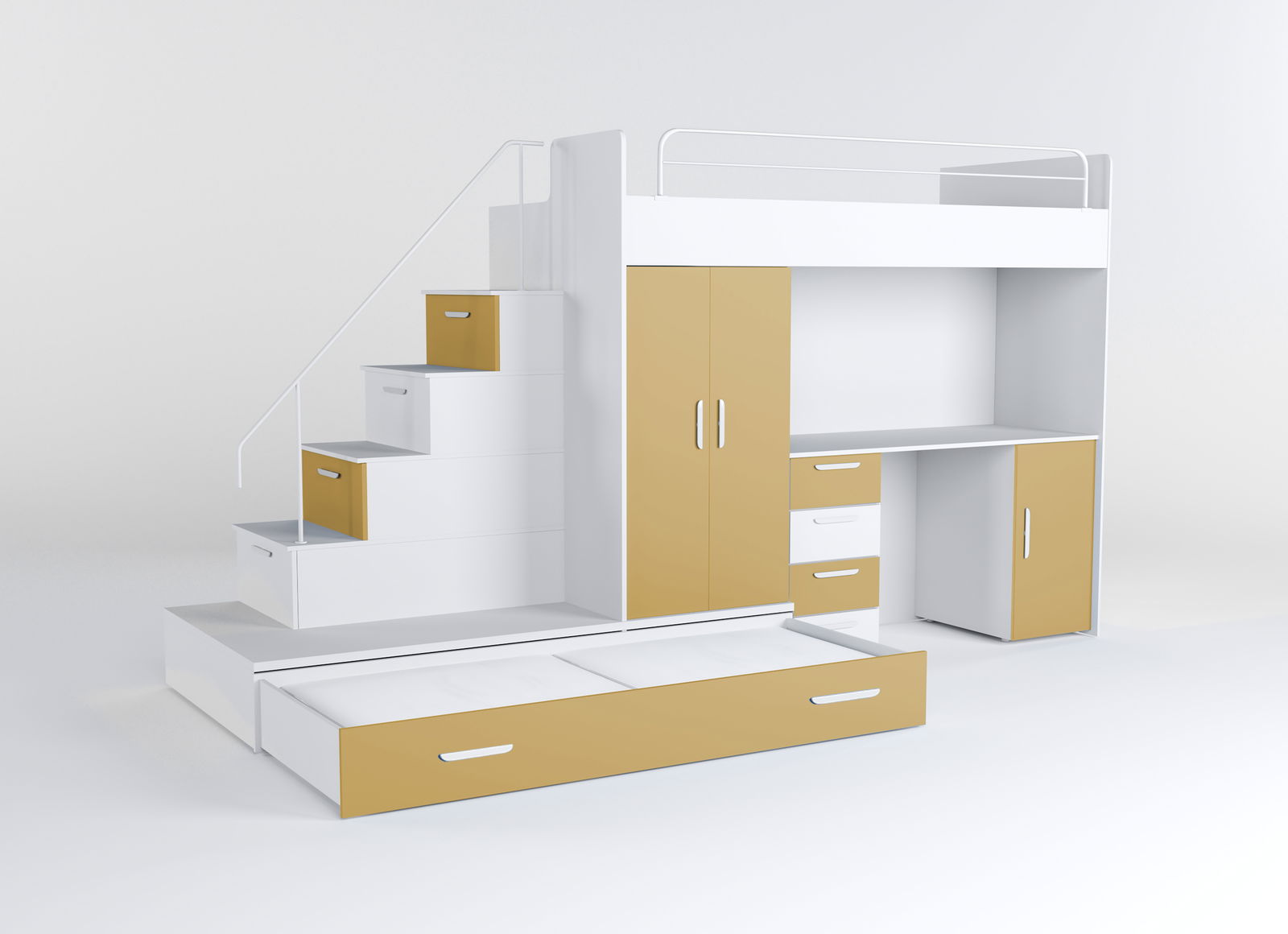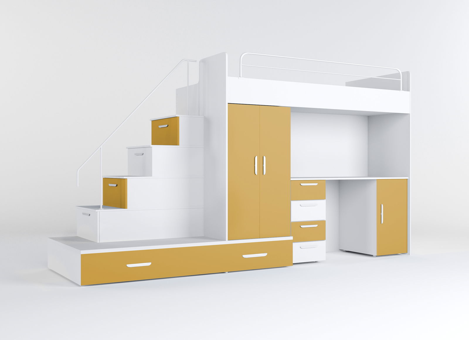 Velmi praktický set do dětského pokoje, kterého součástí je dětská postel, PC stolek, skříň a schody. Ideální i do menších interiérů. Vyrobeno z kvalitní MDF desky, s dvířky a zásuvkami pokrytými akrylovou lakovanou fólií s tloušťkou 0,8 mm.