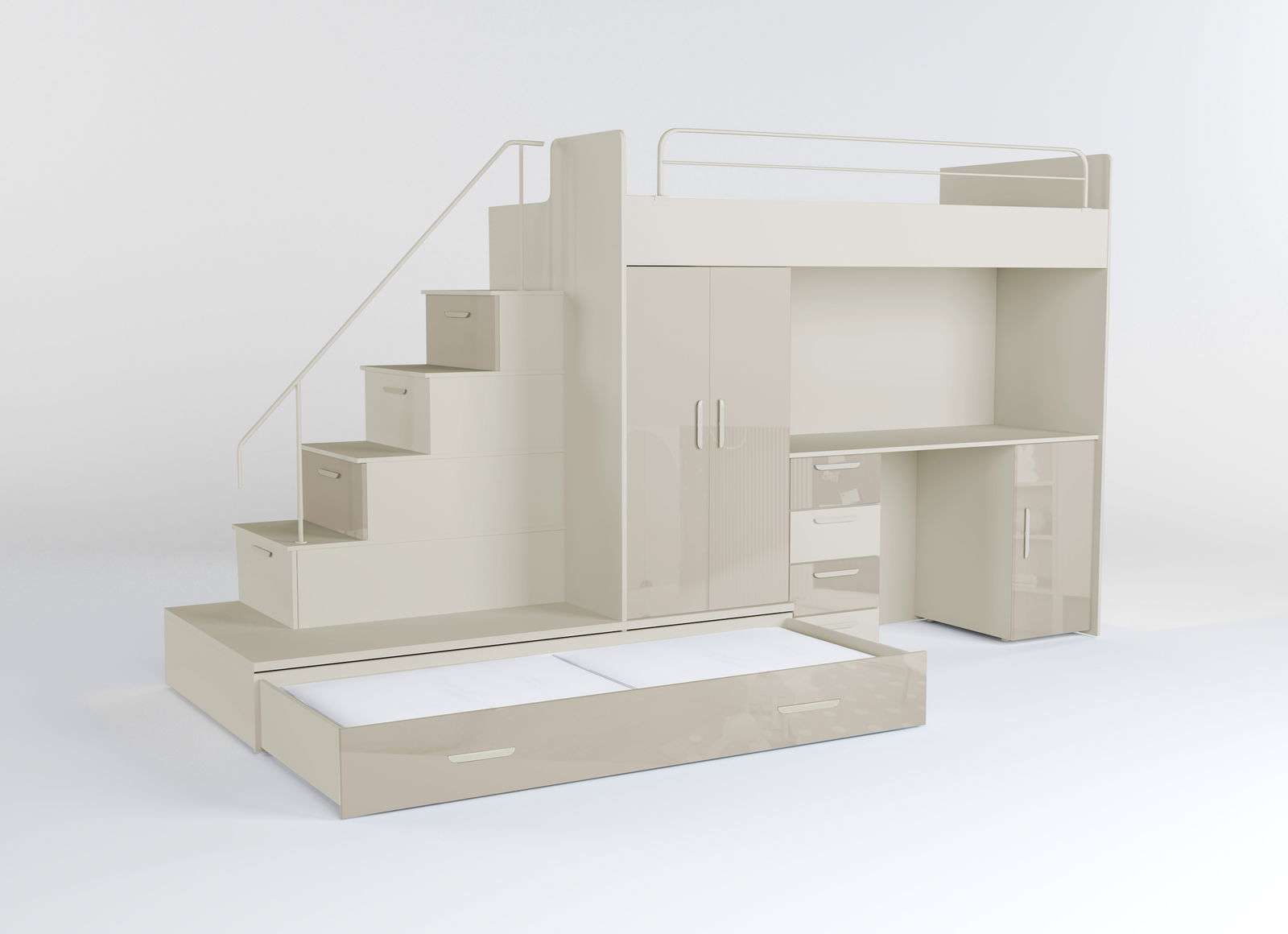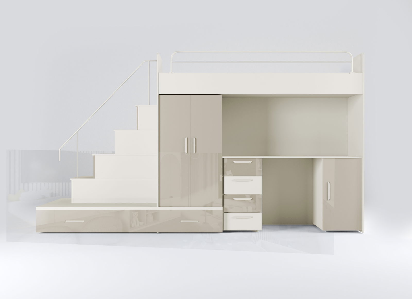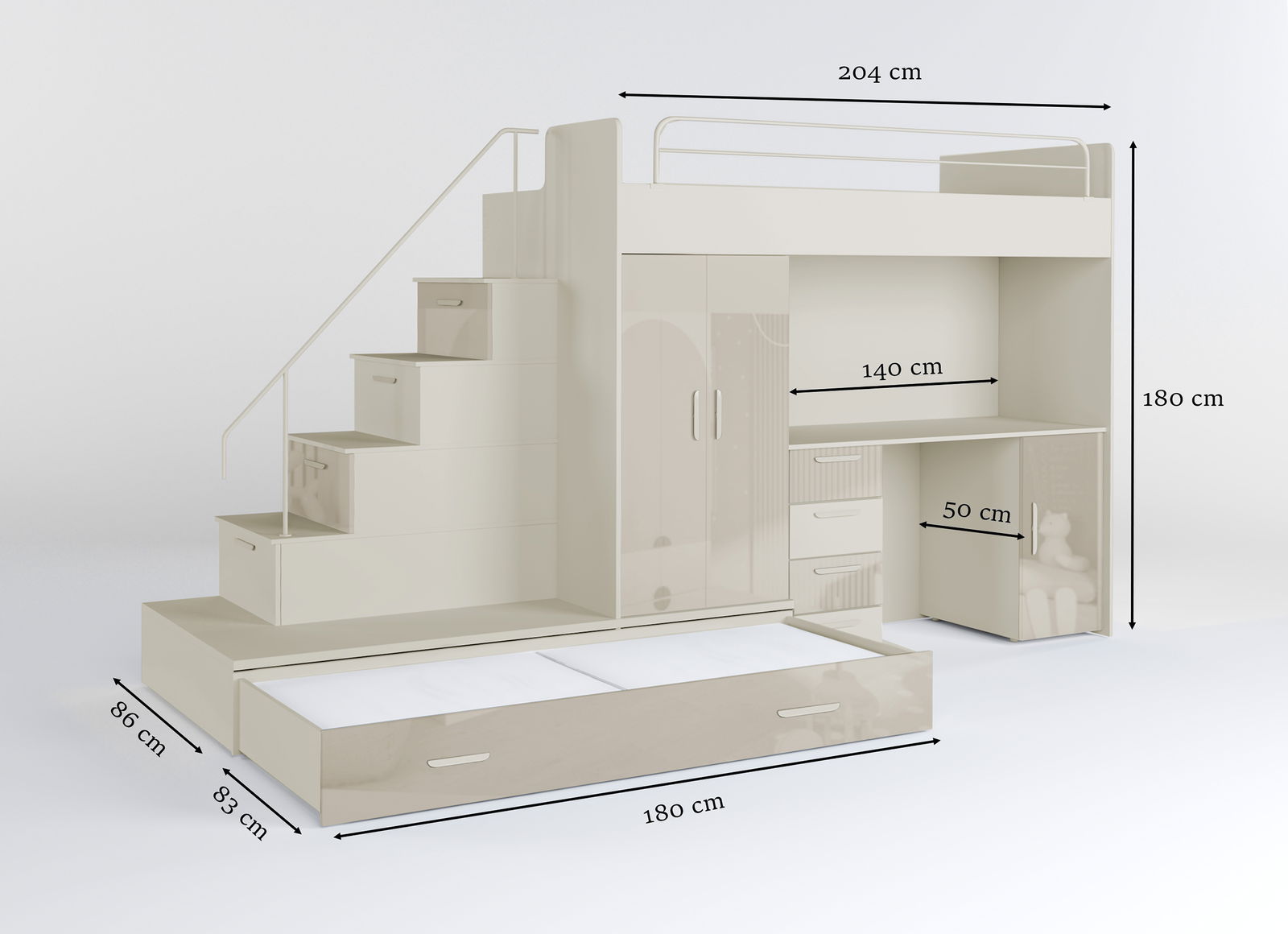 Velmi praktický set do dětského pokoje, kterého součástí je dětská postel, PC stolek, skříň a schody. Ideální i do menších interiérů. Vyrobeno z kvalitní MDF desky, s dvířky a zásuvkami pokrytými akrylovou lakovanou fólií s tloušťkou 0,8 mm.
