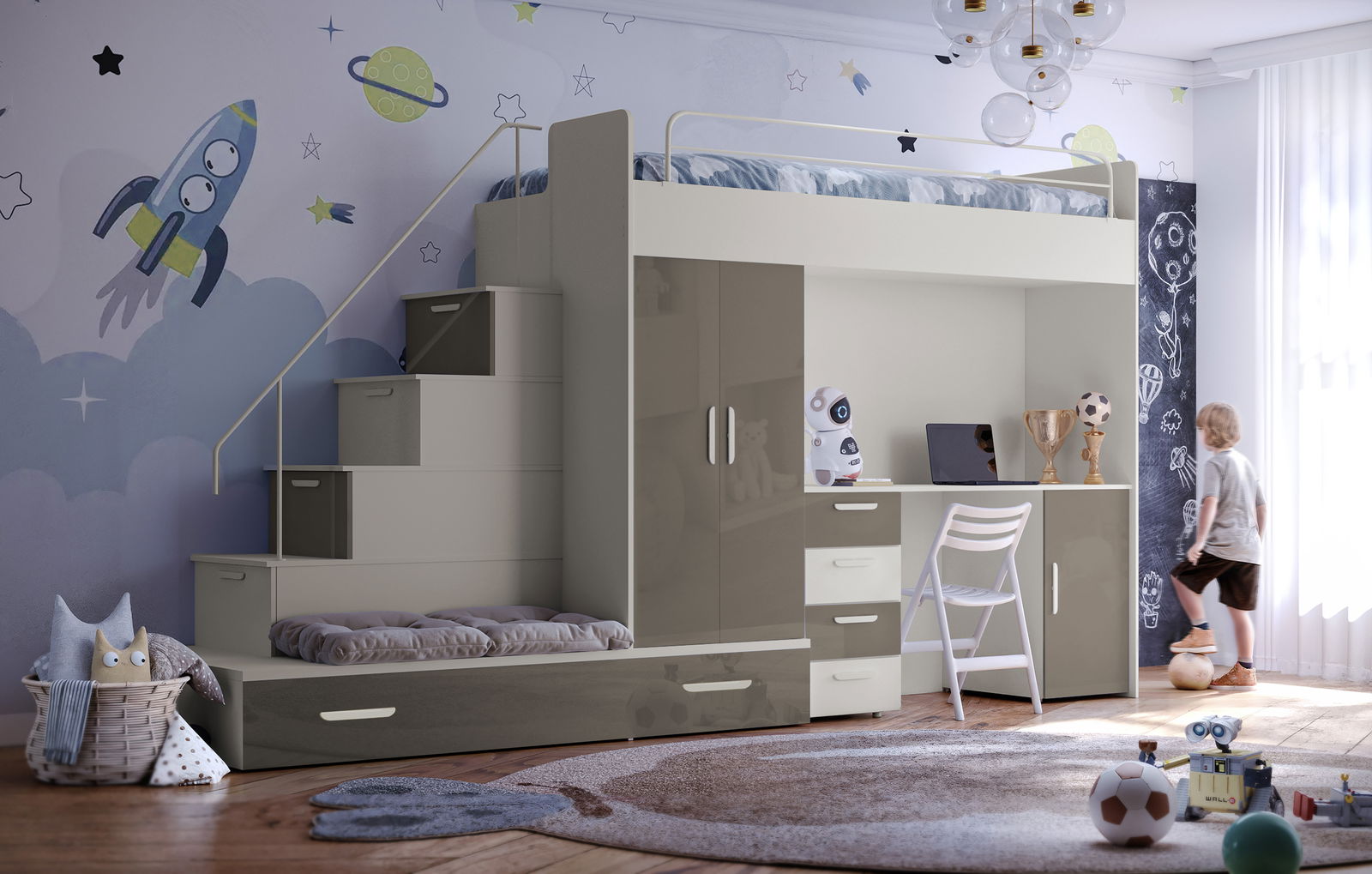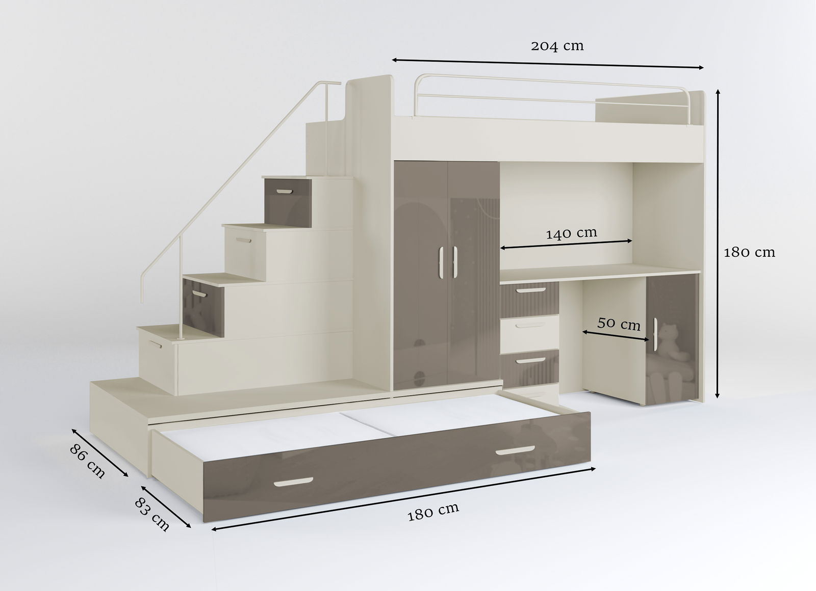 Velmi praktický set do dětského pokoje, kterého součástí je dětská postel, PC stolek, skříň a schody. Ideální i do menších interiérů. Vyrobeno z kvalitní MDF desky, s dvířky a zásuvkami pokrytými akrylovou lakovanou fólií s tloušťkou 0,8 mm.