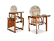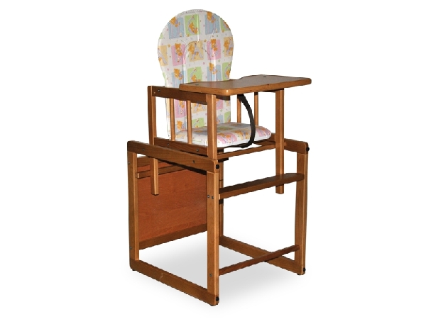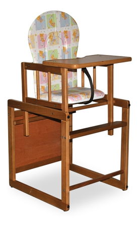 Dětská jídelní židlička s funkcí rozkladu. Židli můžete rozložit a vznikne samostatný stolek s židle k němu. Horní pracovní deska je z odolného materiálu, který je omyvatelný (melamin). Sedací část je pokryta barevným snadno omyvatelným materiálem, vyplněným pohodlným molitanem. Konstrukce se vyrábí z certifikovaného odolného masivního dřeva borovice s cílem zajistit dlouhodobé bezchybné používání. Na výběr máte až 10 moření dřeva.