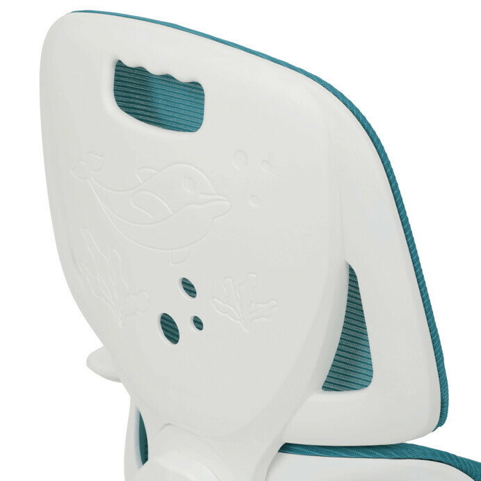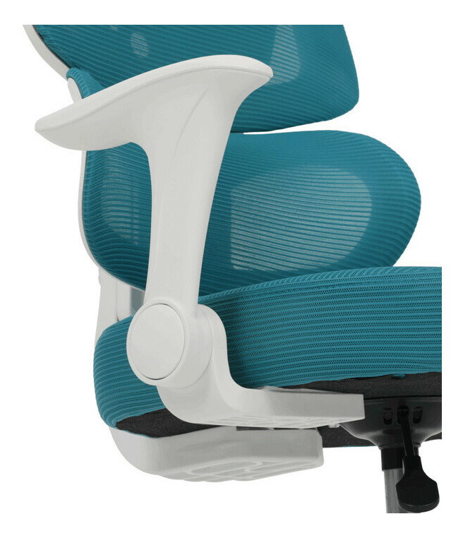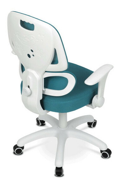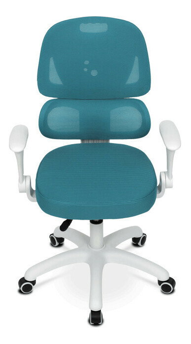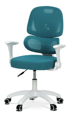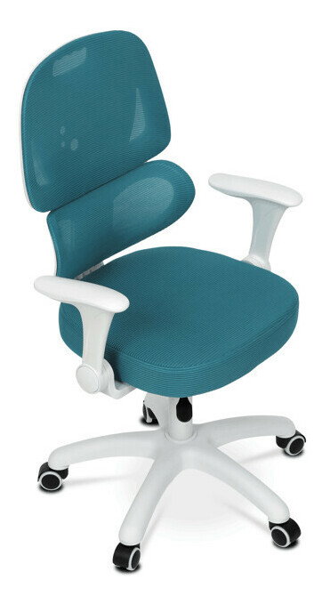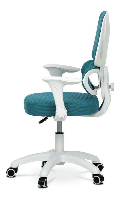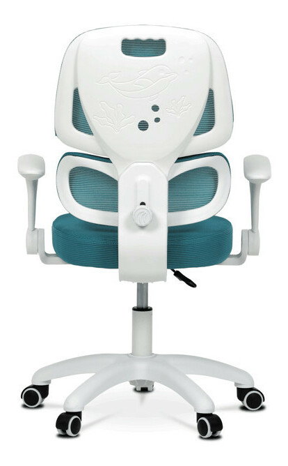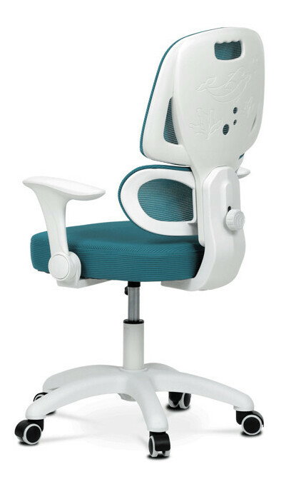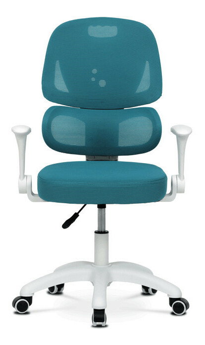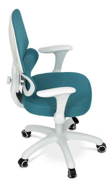 Dětská židle s modrou síťovinou nabízí pohodlné a vzdušné sezení díky prodyšnému materiálu, který podporuje cirkulaci vzduchu. Opěradlo je vybaveno výškově nastavitelnou bederní opěrkou, která zajišťuje správnou podporu spodní části zad, a výškově nastavitelným opěradlem pro individuální přizpůsobení. Odklápěcí područky umožňují snazší přístup k pracovnímu prostoru a zároveň šetří místo. Plastový bílý kříž zaručuje stabilitu a lehkost celé židle, zatímco kolečka jsou vhodná pro tvrdé podlahy, což usnadňuje pohyb po místnosti. Výškově nastavitelný sedák umožňuje optimální přizpůsobení výšky sezení podle potřeby dítěte.