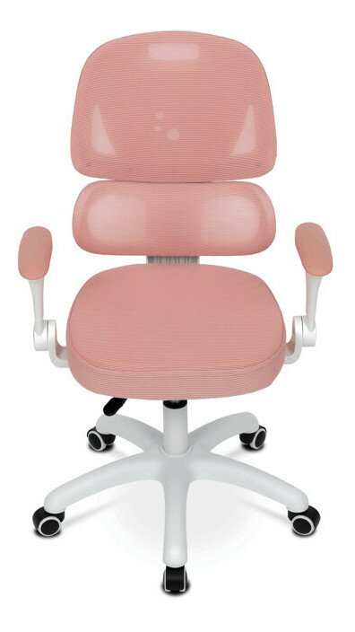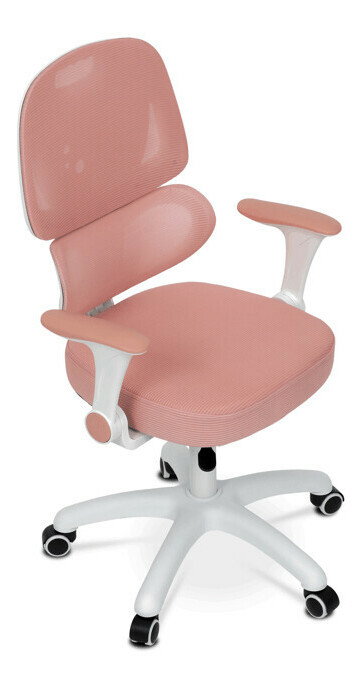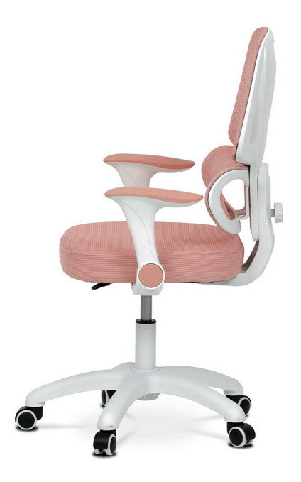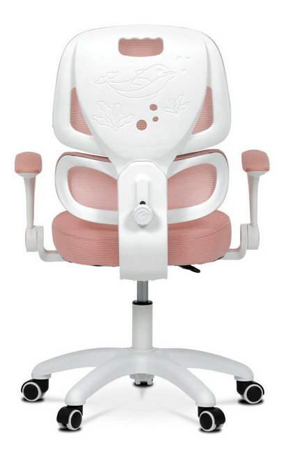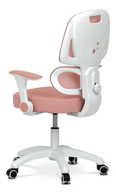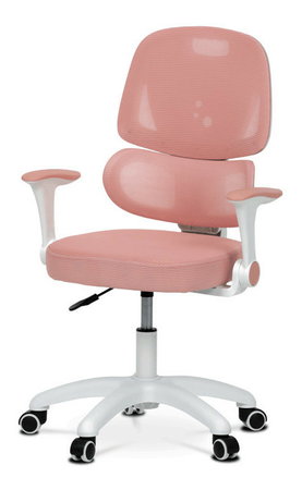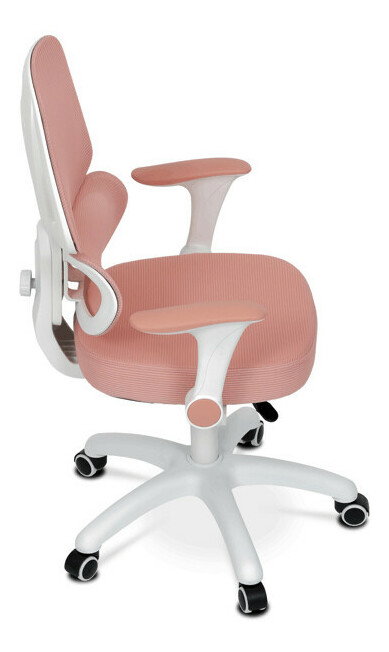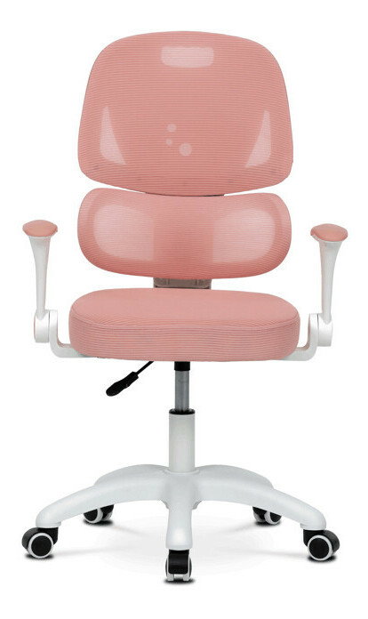 Dětská židle s růžovou síťovinou nabízí moderní a vzdušný design vhodný pro mladší uživatele. Opěradlo i sedák jsou potaženy jemnou růžovou síťovinou, která zajišťuje dobrou cirkulaci vzduchu a příjemný komfort při sezení. Výškově nastavitelné opěradlo a odklápěcí područky umožňují přizpůsobení židle aktuálním potřebám dítěte, zatímco pevný bílý plastový kříž s kolečky určenými pro tvrdé podlahy zajišťuje stabilitu a snadnou mobilitu. Bederní opěrka podporuje správné držení těla během práce nebo hry. Celková konstrukce je navržena tak, aby poskytovala ergonomickou podporu a dlouhodobé pohodlí.