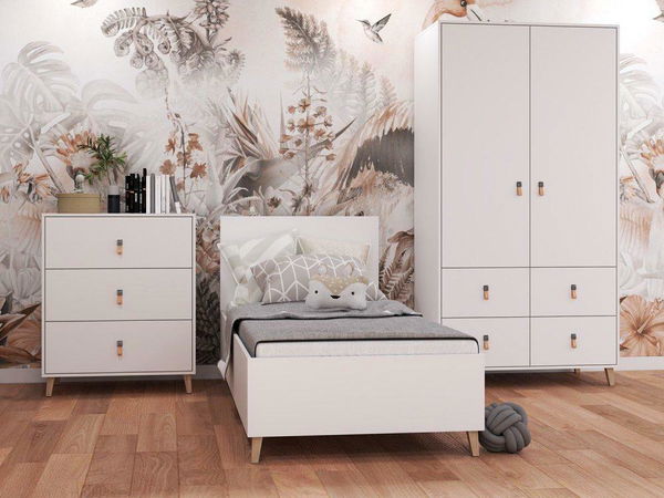 Dětský pokoj Figu 1 v čistě bílém provedení přináší do prostoru světlo, klid a čistotu, kterou si oblíbí děti i rodiče. Vysoká šatní skříň nabízí spoustu místa na oblečení a školní potřeby, zatímco komoda je praktickým pomocníkem pro uskladnění hraček či drobností. Jednolůžková postel s jednoduchým designem vytváří útulné místo k odpočinku a klidný spánek. Celkový vzhled pokoje působí harmonicky, moderně a vytváří ideální prostředí pro dětskou hravost i každodenní povinnosti.