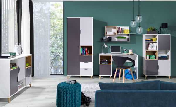 Dětský pokoj Juna 4 je důkazem, že i funkční řešení může být krásné a vizuálně příjemné. Sestava spojuje pestrý, ale harmonický mix barev – bílou, grafitovou, šedou a teplý dekor dub lefkas – v moderním a zároveň hravém designu, který je ideální do pokoje školáka i teenagera. Každý kus nábytku má v pokoji své přesně definované místo a účel, díky čemuž vytváří dobře zorganizované prostředí vhodné pro učení, odpočinek i zábavu. Policová skříň nabízí dostatek prostoru pro oblečení, školní pomůcky či hračky, přičemž je udrží přehledně uspořádané. Regál Juna 6 je ideální pro knihy, boxy či dekorace a pomáhá dětem rozvíjet návyk na pořádek. Komoda Juna 8 poslouží jako praktický pomocník pro vše, co potřebuje své místo – od školních potřeb až po sezónní věci.
