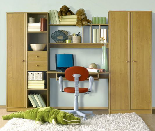 Dětský pokoj sestávající s policové skříně, šatní skříně, pc stolku a policového systému.