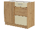 Dolní kuchyňská skříňka Arryn 105 DN 1F BB je vyrobena z laminované dřevotřísky o tloušťce 16 mm pro korpus az MDF pro přední část se sametovým leskem v krémové barvě s dubovým vzhledem. Skříňka má rozměry 82 cm výška, 90 cm šířka a 52 cm hloubka. Úchyty jsou vyrobeny z kovu a mají délku 192 mm, ABS hrany o tloušťce 1 mm. Skříňka nemá tichý dojezd. Pracovní deska není zahrnuta v ceně, ale je k dispozici na webové stránce prodejce.