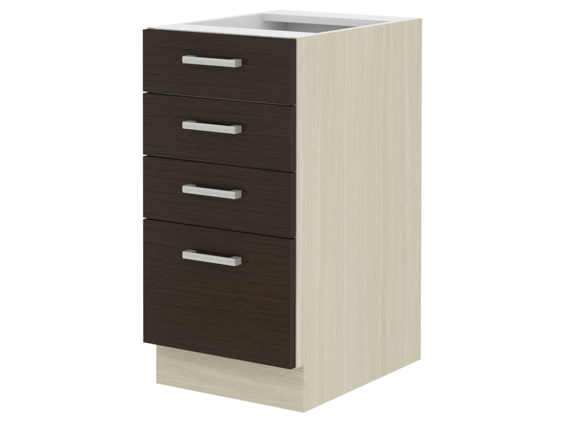 Dolní kuchyňská skříňka Chasma 40 D 4S BB je moderní skříňka se čtyřmi šuplíky v kombinaci tmavého dřeva a dubu Ferara. Materiálem je dřevotříska laminovaná (16 mm) s melaminovými okraji. Skříňka má plastové úchyty (160 mm) a systém tichého zavírání. Dvířka jsou univerzální a lze je montovat vpravo i vlevo. Vnitřek skříně je v barvě bílá a pracovní deska není součástí nabídky.