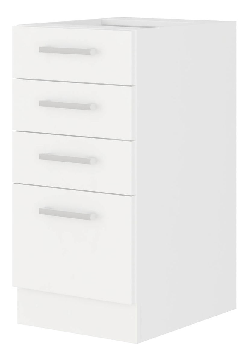 ZobrazitDolní kuchyňská skříňka Edris 40 D 4S BB je moderní skříňka se čtyřmi zásuvkami z kuchyňského sektorového systému. Její bílá barva a ABS hrany dodávají elegantní vzhled. Skříňka je vyrobena z dřevotřísky aminované a dřevotřísky laminované s PVC a má plastové úchyty. Systém tichého zavírání není zahrnut. Vnitřek skříňky je bílé barvy. Pracovní deska není součástí skříňky, ale lze ji zakoupit samostatně.