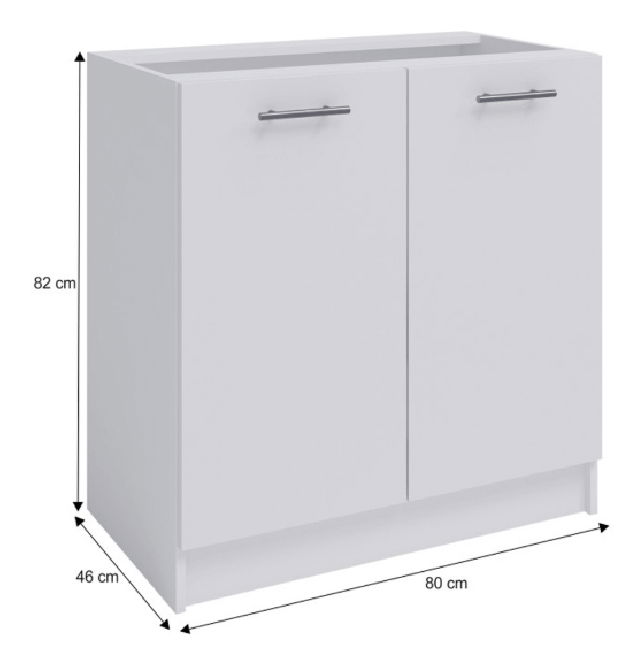 Dolní kuchyňská skříňka Flor S-80 o výšce 82 cm, šířce 80 cm a hloubce 46 cm je moderní a praktická kuchyňská skříňka bez pracovní desky se dvěma dvířky a kovovými úchyty. Skříňka je vyrobena z DTD laminované dřevotřísky v bílé barvě, o tloušťce materiálu 16 mm a dodává se v demontu. Dvířka jsou vybavena moderním tichým systémem zavírání. Ke skříňce doporučujeme dokoupit univerzální dřez a skříňky základní sestavy jsou dodávány včetně pracovní desky, dřezová skříňka je dodávána bez pracovní desky.