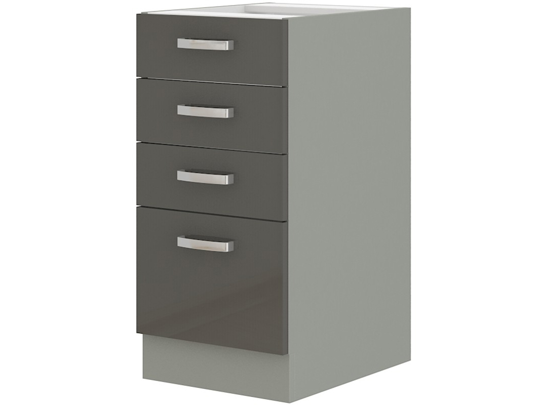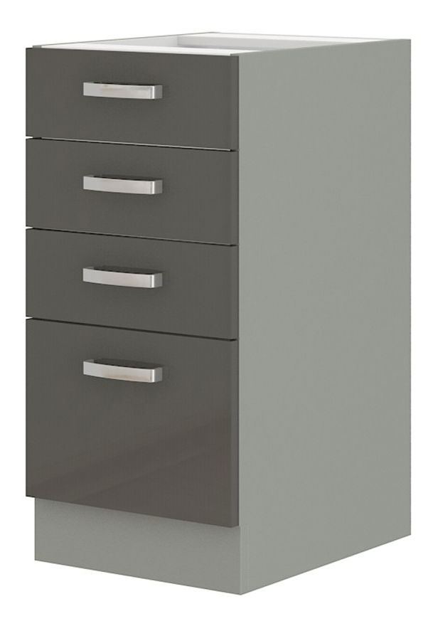 Dolní kuchyňská skříňka Gonir 40 D 4S BB je moderní kuchyňská skříňka se čtyřmi zásuvkami a tichým zavíráním dvířek. Je vyrobena z dřevotřísky laminované šedé barvy s MDF předními panely v šedé barvě. Skříňka má kovové úchyty a je vysoká 82 cm, široká 40 cm a hluboká 52 cm. Kuchyňská sestava je ideální pro ty, kteří preferují jednoduchost a praktičnost v moderním provedení. Skříňka je součástí větší kolekce kuchyňských skříněk a regálů. Pracovní deska není zahrnuta v ceně, ale je k dispozici v prodejně.