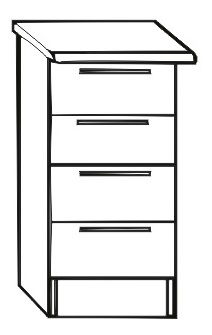 Dolní kuchyňská skříňka se 4 zásuvkami. Korpus skříňky je z DTD laminované v provedení bílá barva, dvířka jsou dub sonoma. Skříňka je dodávána bez pracovní desky.