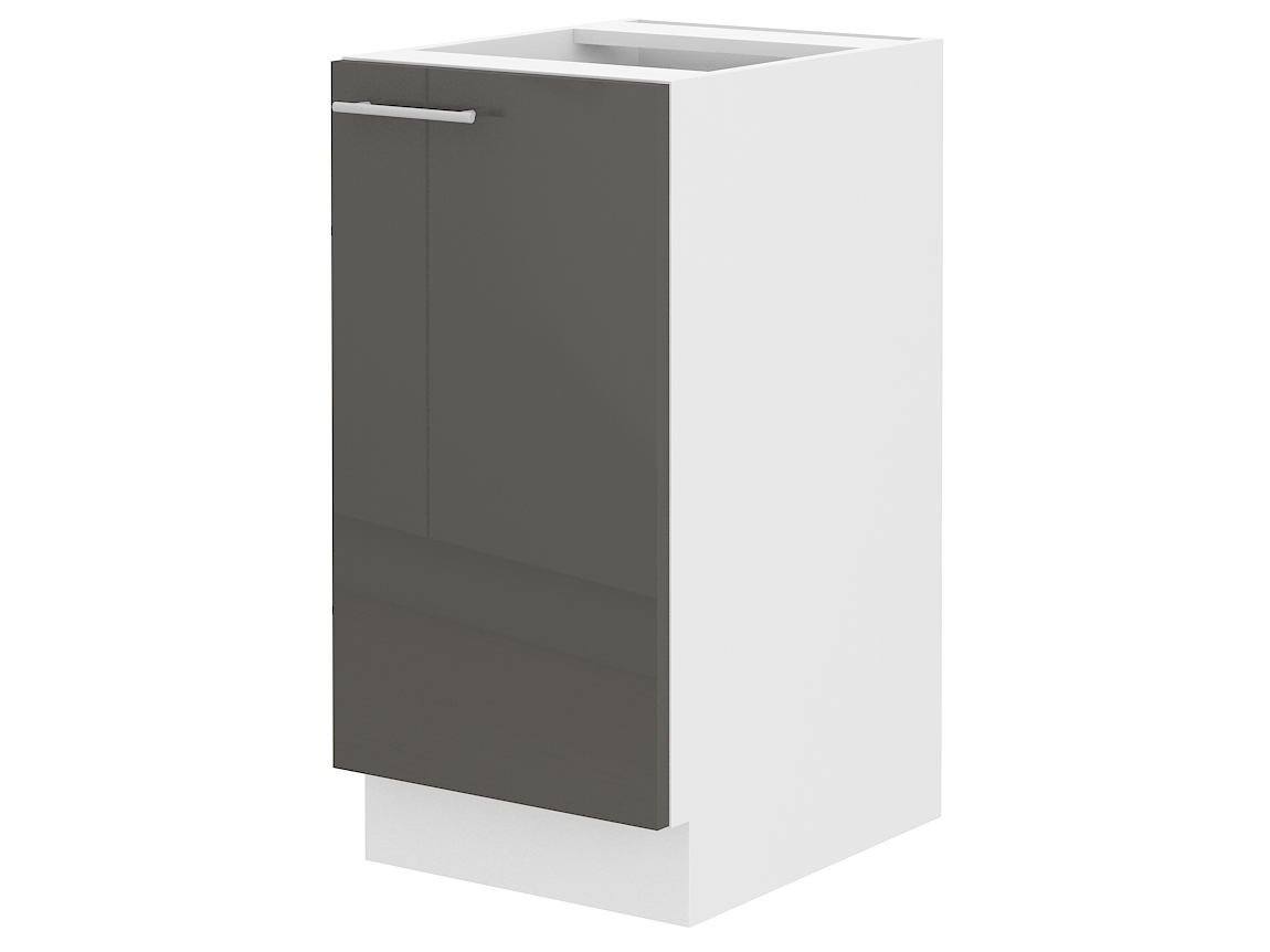 Dolní kuchyňská skříňka Lavera 40 D 1F BB je moderního stylu a nabízí dostatek místa pro uložení kuchyňského náčiní. Systém tichého zavírání dvířek a zásuvek zajistí tiché a plynulé otevírání a zavírání. Skříňka má lesklý povrch v šedé barvě a korpus v bílé barvě. Materiál skříňky je MDF a dřevotříska laminovaná s ABS hranami. Úchyty jsou chromované. Pracovní deska není součástí ceny, ale je k dispozici v nabídce.