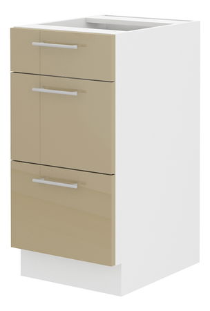 Dolní kuchyňská skříňka Lavera 40 D 3S BB je moderní skříňka se třemi zásuvkami kuchyňského sektorového systému. Je dostupná v několika barevných variantách s lesklým povrchem. Skříňky mají systém tichého zavírání dvířek a tichého dorazu zásuvek. Korpus je bílý a fronta má lesk cappucino. Materiál fronty je MDF a korpus je vyroben z dřevotřísky laminované. Skříňka má chromové úchyty a dvířka jsou univerzální, lze je namontovat vpravo i vlevo. Vnitřek skříňky je v barvě bílá. Pracovní deska není součástí ceny, ale je k dispozici v nabídce v různých variantách.