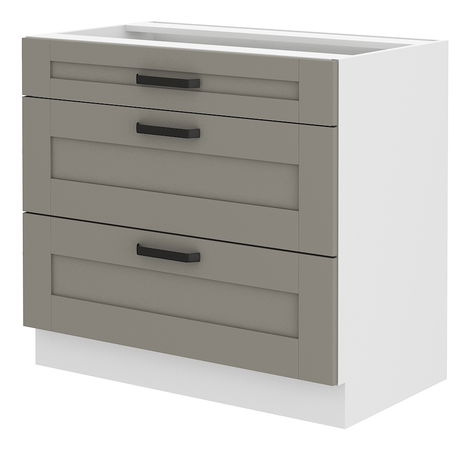 Dolní kuchyňská skříňka Lucid 80 D 3S BB je rustikální kuchyňská skříňka se třemi zásuvkami v sektorovém systému. Skříňka má bílý korpus a přední MDF desku v odstínu ClayGrey. univerzální a otevírají se doleva i doprava. Pracovní deska není součástí nabídky, ale je k dispozici na webové stránce.
