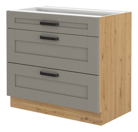 Dolní kuchyňská skříňka Lucid 80 D 3S BB je rustikální skříňka se třemi zásuvkami kuchyňského sektorového systému. Její korpus je vyroben z dřevotřísky laminované a má dubový artisan design. Přední strana je vyrobena z MDF desky s claygrey barvou a BS a systém tichého zavírání. deska není součástí ceny, ale je k dispozici na webové stránce prodejce.
