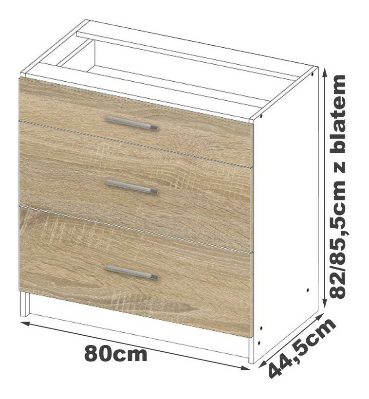 Kuchyňská skříňka Lula je jedním z mnoha návrhů z kolekce Lima, která je mezi zákazníky oblíbená. Poskytuje spoustu místa pro odkládání nezbytných kuchyňských potřeb - potravin, nádobí, příborů a malých pomůcek, které usnadňují přípravu jídel. Skříňka sestává ze tří zásuvek. Nábytek kombinuje dvě velmi módní a praktické barvy, kterými jsou bezpochyby bílá a dub sonoma. Světlé rukojeti jsou dokonalým doplňkem celku. Prezentovaná stojící skříň i ostatní nábytek z kolekce Lula jsou vyrobeny z laminované desky, která zajišťuje trvanlivost a odolnost proti oděru. Skříňka se zásuvkami je nezbytným prvkem v každé kuchyni.