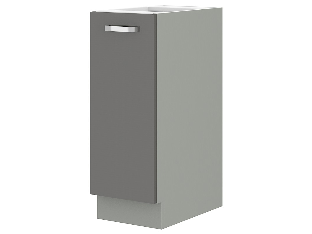 Dolní skříňka na koš Gonir 30 D CARGO BB je moderní a praktická skříňka pro koš z kuchyňského sektorového systému. Je vyrobena z kvalitních materiálů - MDF a dřevotřísky laminované šedé barvy s ABS hranami. Skříňka obsahuje kovové úchyty a chromový cargo koš s boční montáží na pravou stranu. Vnitřek skříně je bílé barvy a má slepé vyvrtané otvory pro rukojeť. Je možné vybrat si z dalších variant skříněk a regálů. Tato skříňka je součástí kuchyňské sestavy Gonir, která je ideální pro zákazníky, kteří hledají jednoduchost a praktičnost v moderním provedení. Pracovní deska není součástí ceny, ale lze ji zakoupit zvlášť. Vyobrazená pracovní deska má tloušťku 28 mm a je v metalické hnědé barvě.