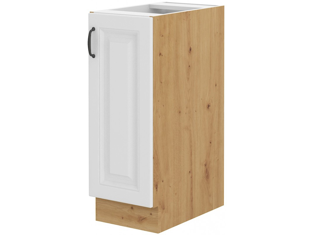 Dolní skříňka na koš Sheila 30 D CARGO BB (dub artisan + bílá) je moderní dolní skříňka pro koš z kuchyňského sektorového systému, která má výšku 82 cm, šířku 30 cm a hloubku 52 cm. Je vyrobena z dřevotřísky laminované (16 mm), s MDF deskou (16 mm) v bílém matném provedení. Skříňka má kovové úchyty (192 mm) a systém tichého zavírání s univerzálními dvířky, které lze namontovat vpravo i vlevo. Bílý interiér skříňky a slepé vyvrtané otvory pro rukojeť jsou součástí chomového cargo koše. Pracovní deska není součástí ceny, ale je k dispozici na stránce prodejce. Tato skříňka je součástí kuchyňské sestavy Sheila, která umožňuje sestavit si kuchyni dle vlastních představ v rustikálním stylu s moderními prvky.