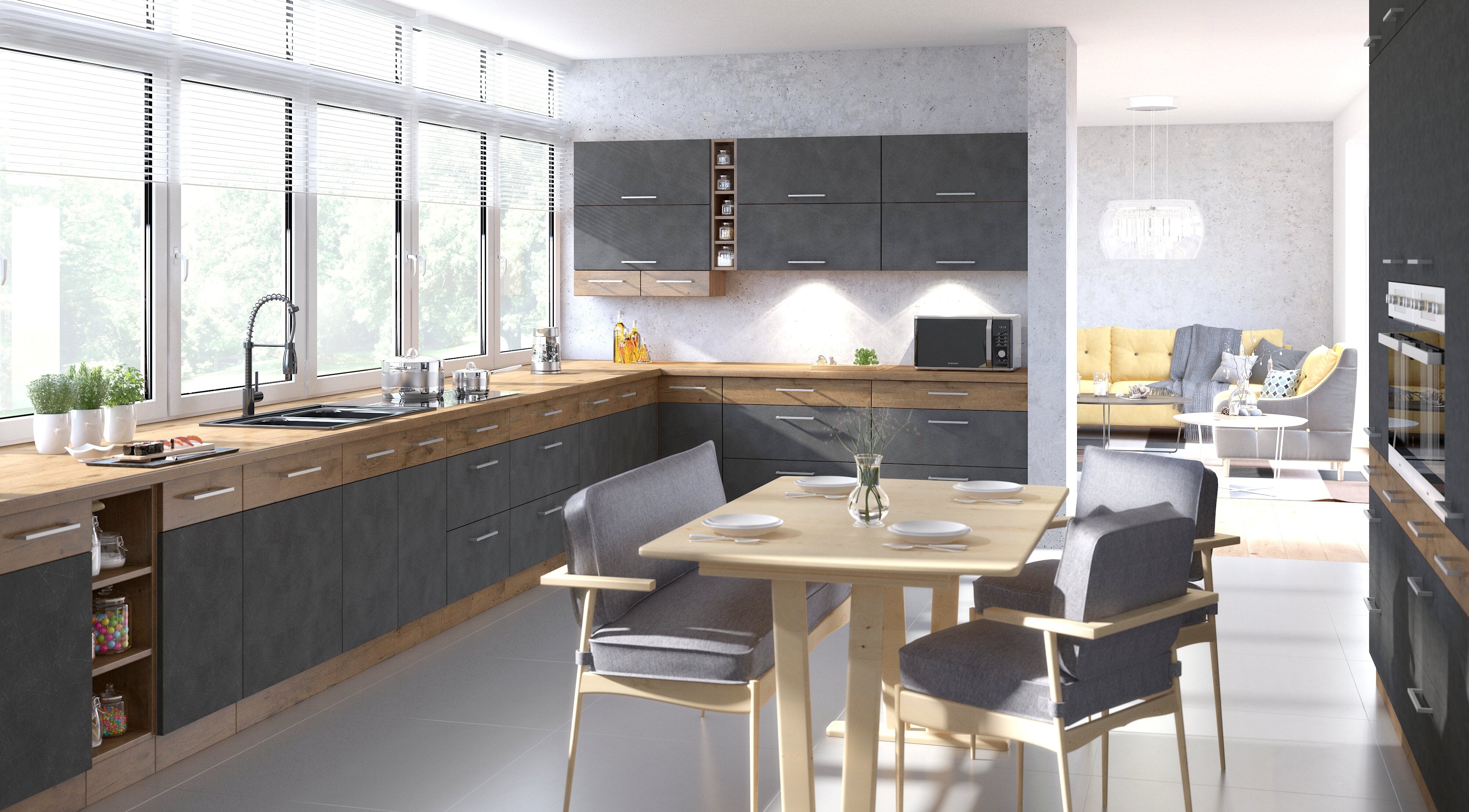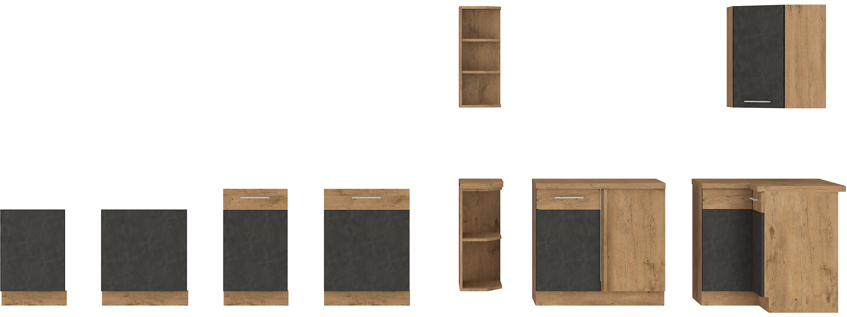 Staňte se pro tuto chvíli architektem a designér vlastní kuchyně. Nabízíme Vám směs designových skříněk v barvě bílá, šedá a bordó v kombinaci dubu Lancelot. Přáli jste si mít troubu v úrovni učí, nebo ji máte rádi v dole. Přáli jste si skříňky s výklopnými dvířky nebo klasicky doprava či doleva. Výběr je na vás a na vaší fantazii.