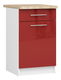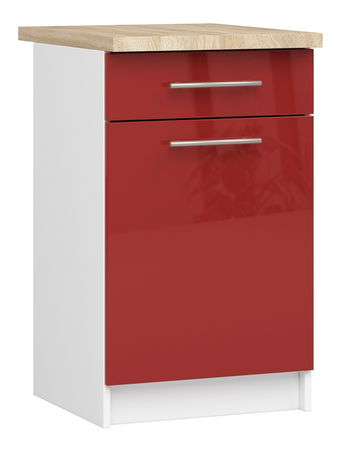 Kuchyňská skříňka v nadčasové a velmi univerzální bílé barvě s lesklými červenými čely. Moderní nerezové rukojeti zajišťují dlouhé a bezproblémové používání. Skříňka má prostornou zásuvku na kuchyňské náčiní a dvířka a uvnitř poličku pro umístění co nejvíce doplňkového kuchyňského příslušenství. Stolová deska je vyrobena z laminované desky a má rozměry 50 cm/60 cm.