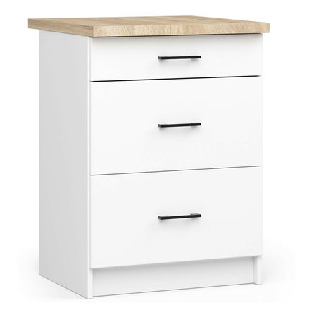 Zásuvky jsou v kuchyni nezbytné. Umožňují uložit drobné příslušenství potřebné při přípravě jídel, příborů nebo koření. Proto jsme v rámci kolekce Ozara připravili stojící skříňku sestávající ze tří prostorných zásuvek. Bílá kuchyňská skříňka s deskou dub sonoma je určena pro modulární výstavbu. Černé matné rukojeti dokonale kontrastují s nadčasovými bílými předními částmi. Univerzální design nábytku, jeho funkčnost a jednoduchost použití nejsou jedinými výhodami této nabídky. Skříňka široká 60 centimetrů je vyrobena z laminované desky, která je odolná vůči poškození. Prezentovaný kus kuchyňského vybavení bude dokonale ladit s ostatním nábytkem z kolekce Ozara. Stolová deska je vyrobena z laminované desky a má rozměry 60cm/60cm.