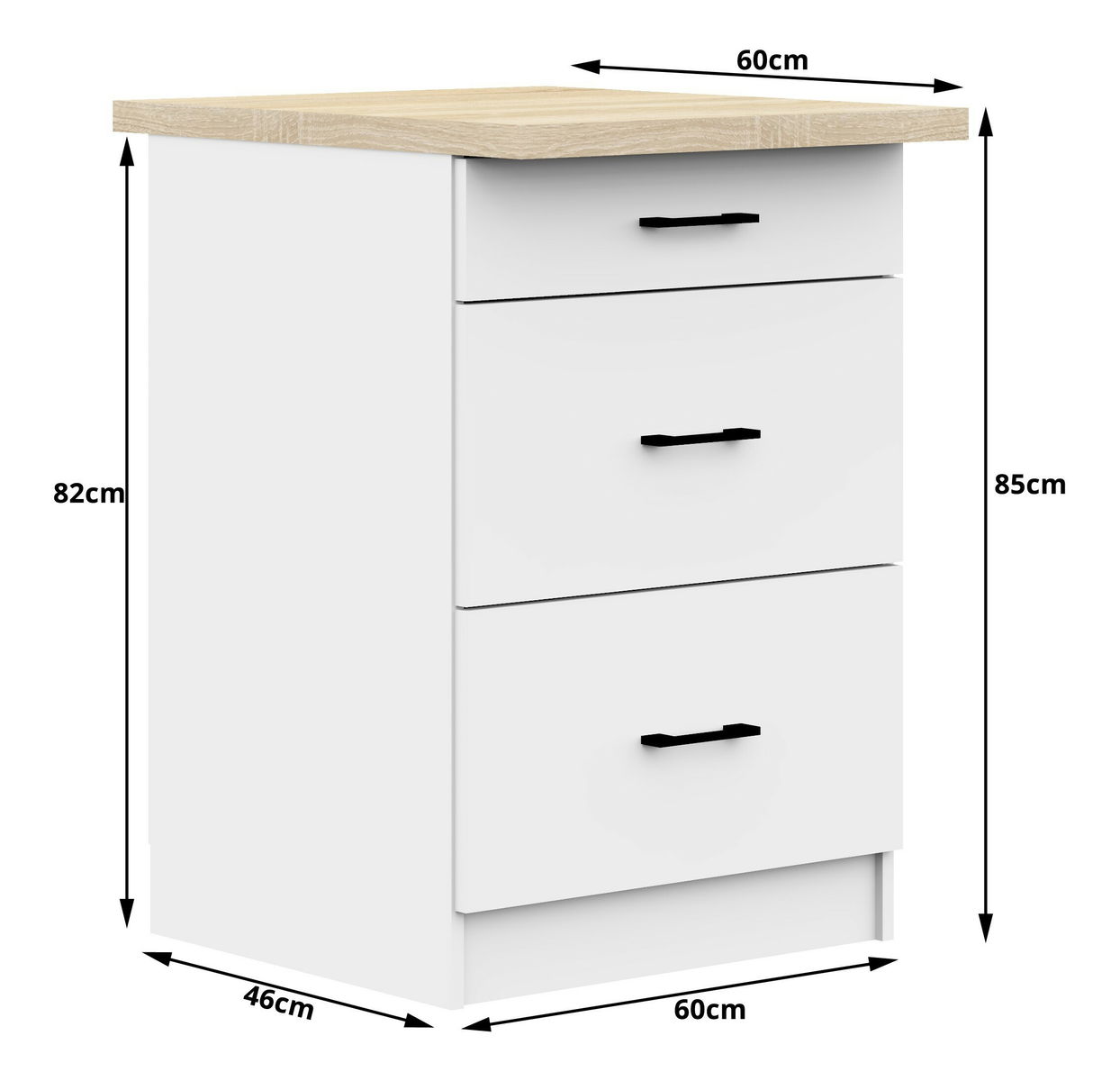 Zásuvky jsou v kuchyni nezbytné. Umožňují uložit drobné příslušenství potřebné při přípravě jídel, příborů nebo koření. Proto jsme v rámci kolekce Ozara připravili stojící skříňku sestávající ze tří prostorných zásuvek. Univerzální design nábytku, jeho funkčnost a jednoduchost použití nejsou jedinými výhodami této nabídky. Skříňka široká 60 centimetrů je vyrobena z laminované desky, která je odolná vůči poškození. Prezentovaný kus kuchyňského vybavení bude dokonale ladit s ostatním nábytkem z kolekce Ozara. Stolová deska je vyrobena z laminované desky a má rozměry 60cm/60cm.