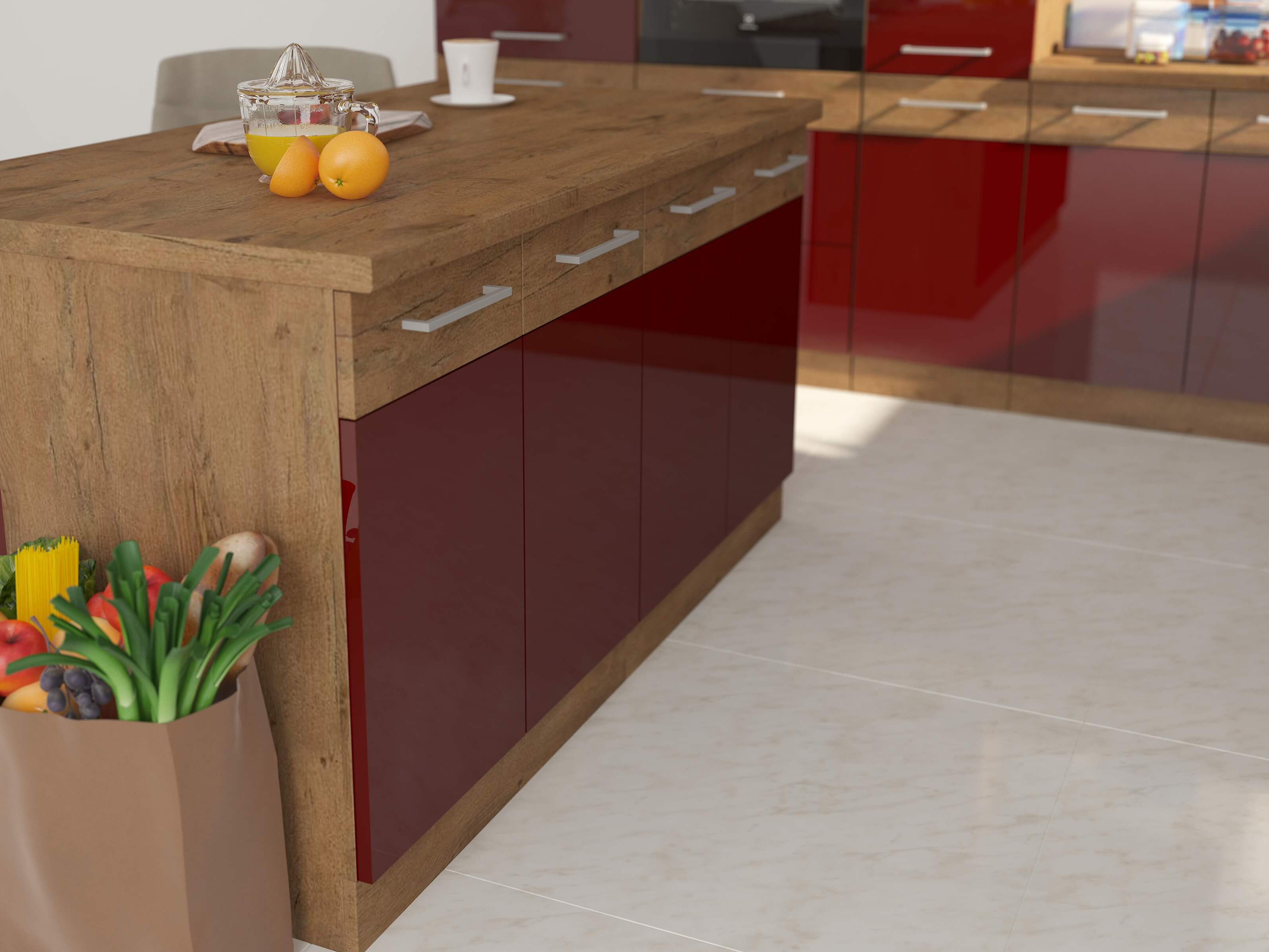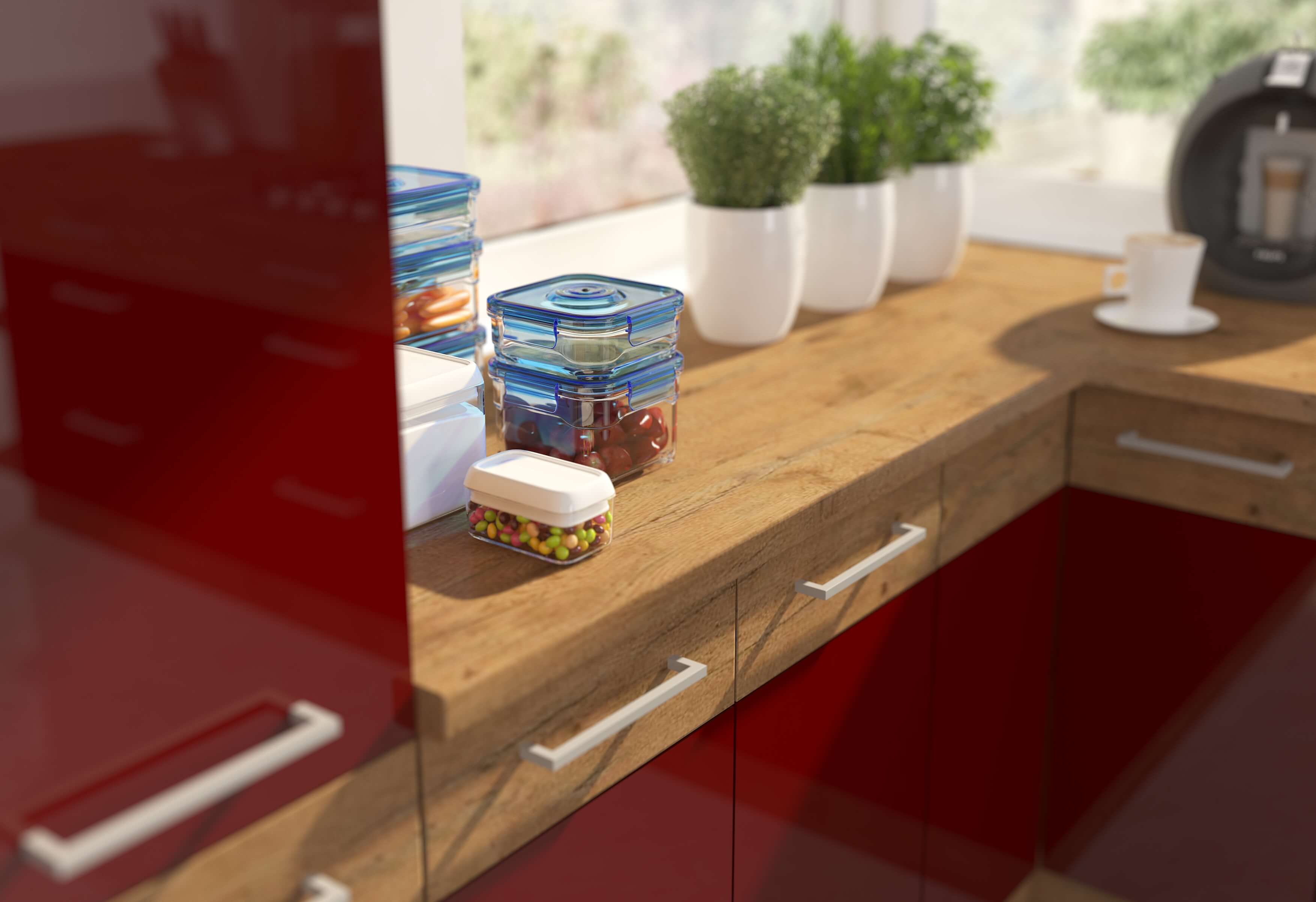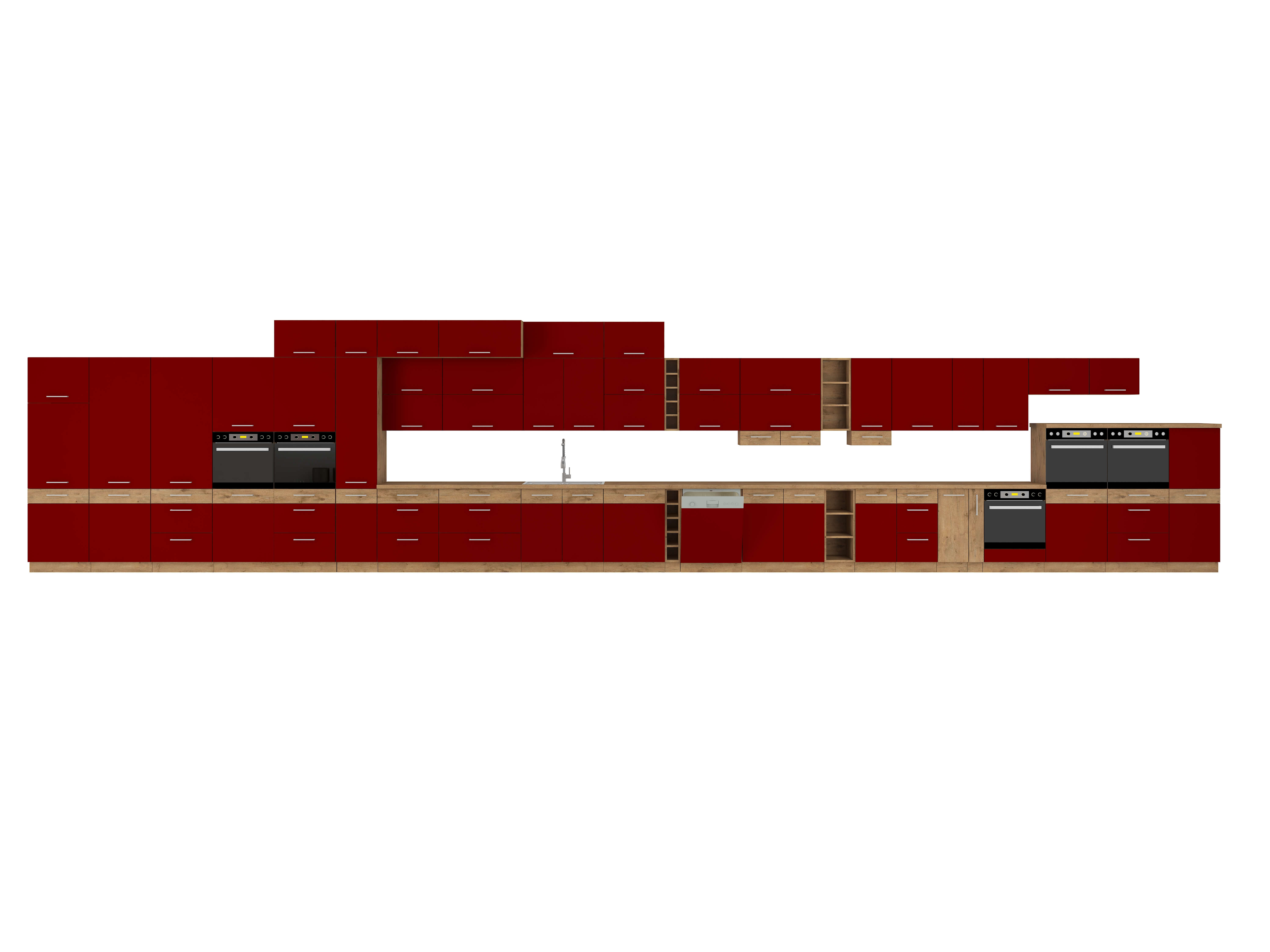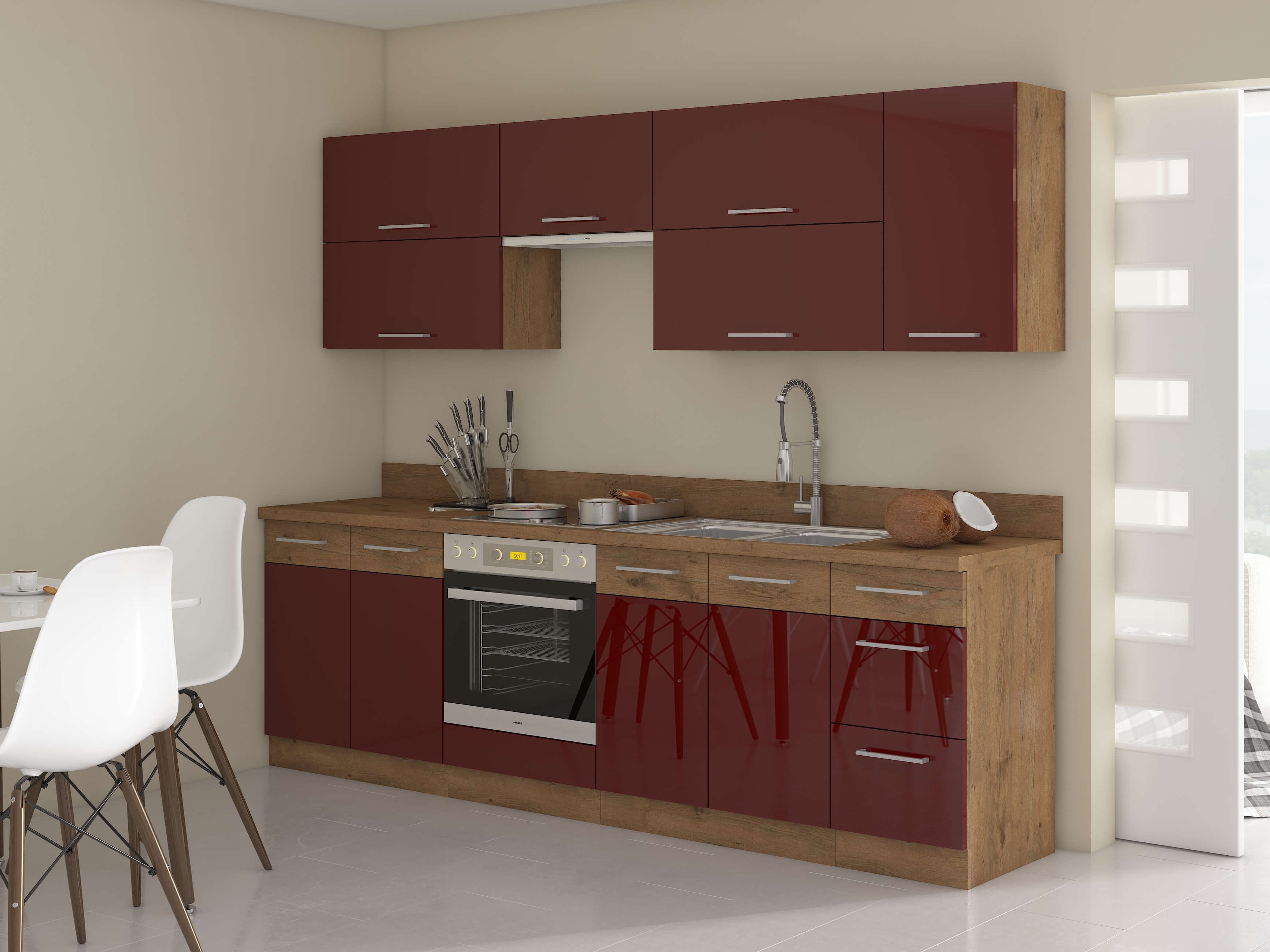 Staňte se pro tuto chvíli architektem a designér vlastní kuchyně. Nabízíme Vám směs designových skříněk v barvě bílá, šedá a bordó v kombinaci dubu Lancelot. Přáli jste si mít troubu v úrovni učí, nebo ji máte rádi v dole. Přáli jste si skříňky s výklopnými dvířky nebo klasicky doprava či doleva. Výběr je na vás a na vaší fantazii.