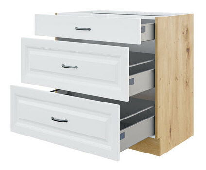 Kuchyně je srdcem každé domácnosti. Pro zajištění dobrého využití jejího prostoru byla vytvořena spodní kuchyňská skříňka Vintageline 80 D 3S BB se zásuvkami. Jedná se o mimořádně praktický model, který poskytne prostor pro uložení kuchyňských doplňků, koření nebo příborů. Její tlumený vzhled umožní doplnit téměř každé zařízení. Mezi funkční přednosti této varianty patří tichý systém zavírání a zásuvky Premium Box. Takto vybavená kuchyňská skříňka vám umožní uspořádat si prostor. Praktické kovové úchyty se postarají o snadné otevírání.