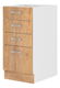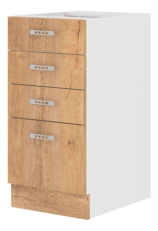 Dolní kuchyňská skříňka Sylrona 40 D 4S BB je moderní kuchyňská skříňka s bílým korpusem a přední částí z dubu Lefkas. Má čtyři zásuvky a je součástí kuchyňské sestavy Loile, kterou si můžete sestavit podle svých představ – je k dispozici v několika barevných provedeních. Skříňka je vyrobena z dřevotřískové laminované desky s melaminovými okraji, plastové úchyty a univerzální dvířka, která lze namontovat vpravo i vlevo. Vnitřek skříně je v bílém provedení, pracovní deska není součástí balení. Vyobrazená pracovní deska má tloušťku 28 mm a je v metalic brown barvě.