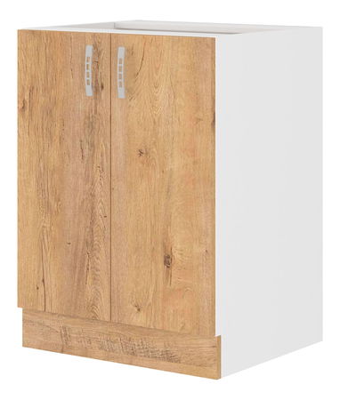 Dolní kuchyňská skříňka Sylrona 60 D 2F BB je moderní dvoudveřová skříňka v bílém korpusu as dubovým Lefkasovým předním panelem. Skříňka je součástí kuchyňského sektorového systému a nabízí další varianty skříněk a regálů. Kuchyně Loile je elegantní a příjemná v barevném provedení, které můžete přizpůsobit svému prostoru a vkusu. Materiál skříňky je dřevotříska laminovaná s melaminovými okraji, s plastovými úchyty a bez systému tichého zavírání. Dvířka kuchyňských skříněk jsou univerzální a lze je namontovat vpravo i vlevo. Pracovní deska není součástí ceny, ale je k dispozici na webové stránce. Vyobrazená pracovní deska má tloušťku 28 mm a barvu Metalic brown.