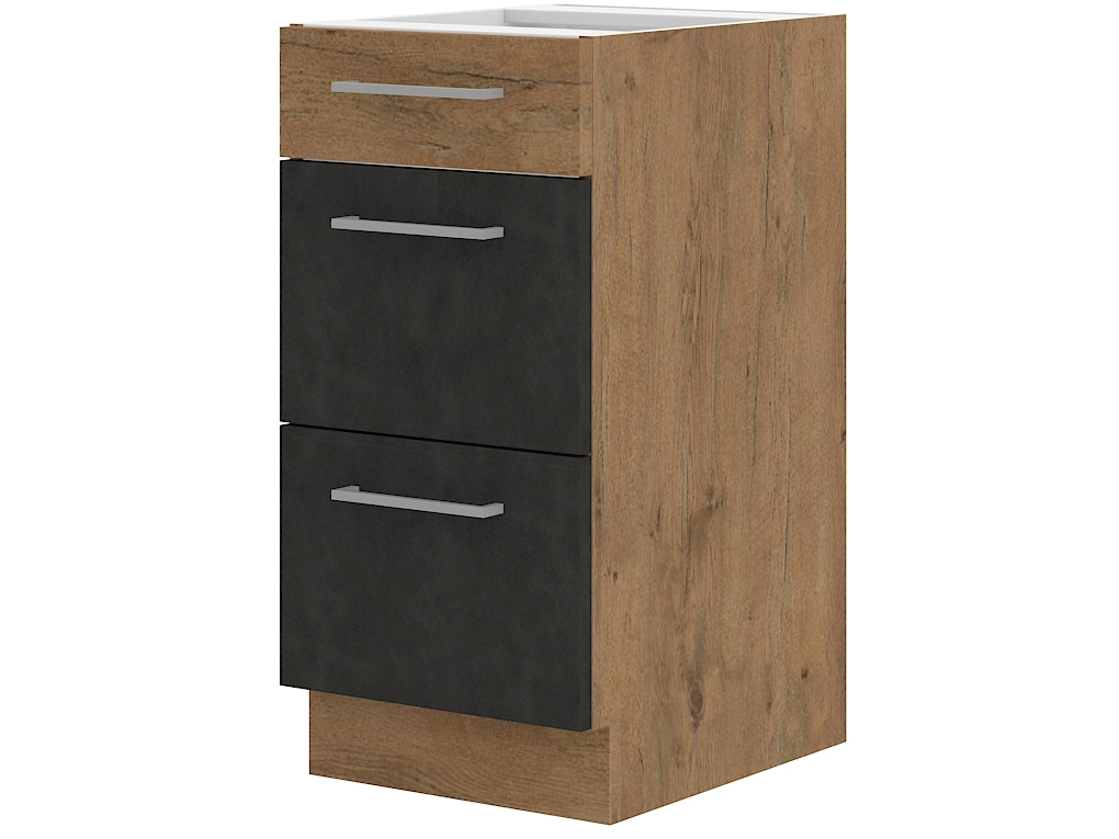 Dolní kuchyňská skříňka Virion 40 D 3S BB je moderní kuchyňská skříňka se 3 zásuvkami a kombinací barev dub lancelot a šedá. Její výška je 82 cm, šířka 40 cm a hloubka 52 cm. Korpus je vyroben z dřevotřískové laminované desky a přední strana je z MDF s ABS hranami. Skříňka má plastové úchyty s možností příplatku za kovové úchyty. Dvířka jsou univerzální a lze je namontovat na obou stranách. Vnitřek skříňky je v barvě bílá a produkt má vyvrtané otvory pro rukojeť. Pracovní deska není součástí produktu a nabízí se samostatně.