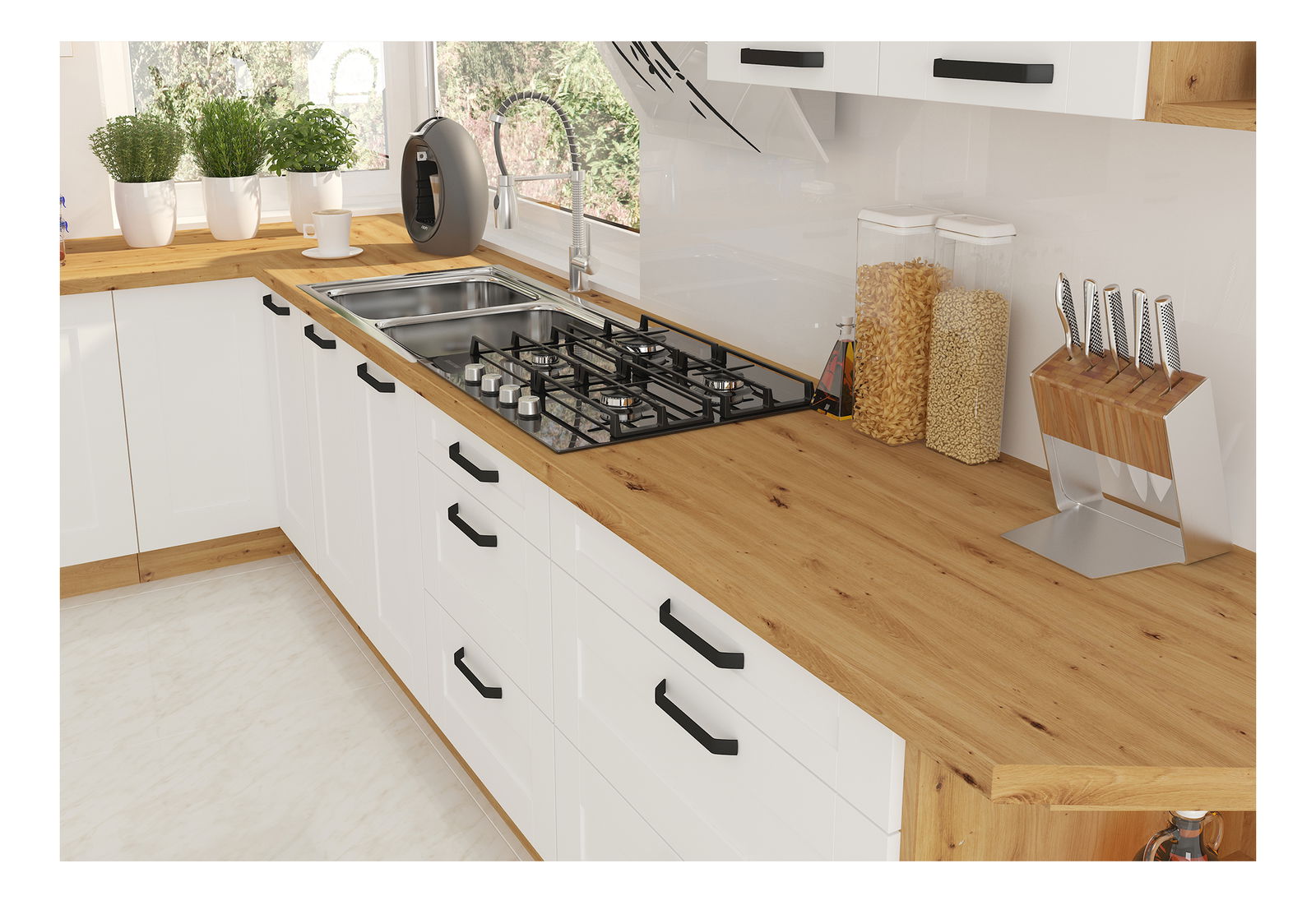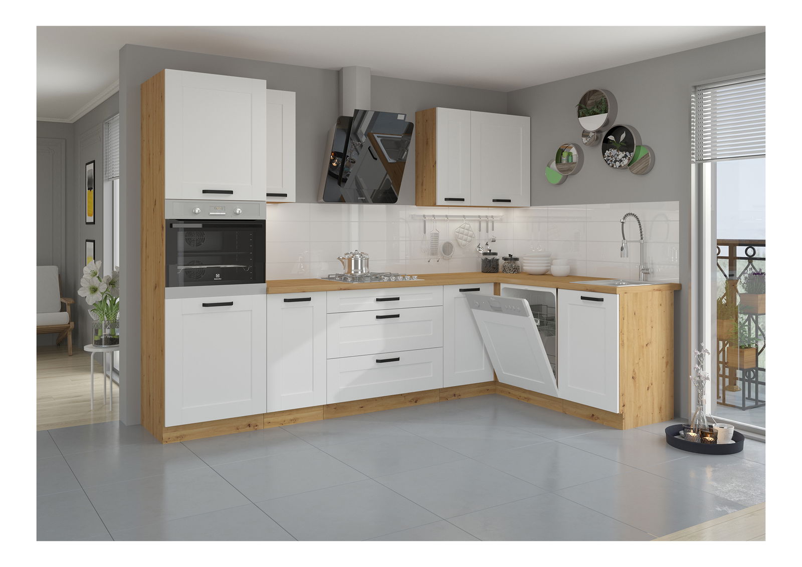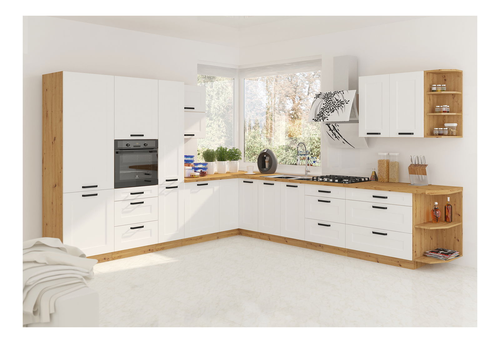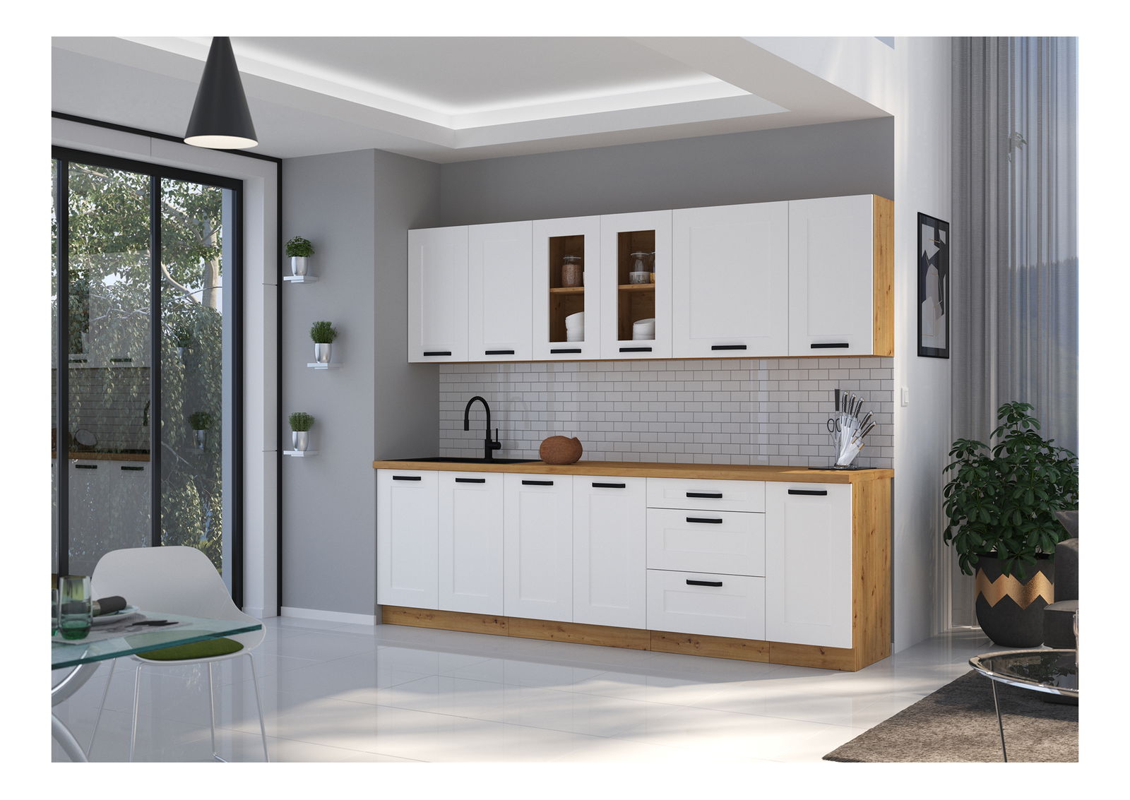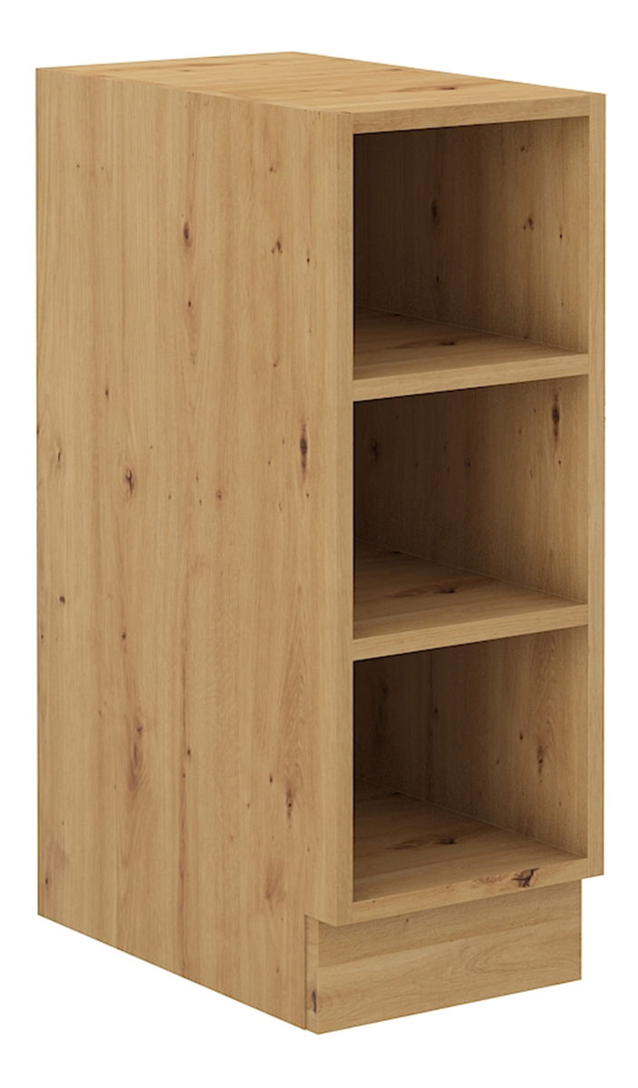 Čisté linie, stylový design a v neposlední řadě praktické řešení vaší kuchyně. To je kuchyňská linka Lesana. Stylová svým barevným provedením, praktická a funkční pro řadu výběru z různých horních a dolních skříněk. Lesana je vyrobena z kvalitní laminované dřevotřísky DTD, která je odolná vůči mechanickému poškození. Vyniká dlouhou životností, a to přece tak aktivní místnost, jakou je právě kuchyně, opravdu potřebuje. Čisté linie představují spojení bílého provedení s provedením dub artisan. Nabídka kuchyňské linky Lesana je opravdu bohatá. Najdete v ní zavřené i otevřené vrchní a spodní skříňky, vysokou potravinovou skříňku i příslušenství, jako například dvířka na myčku nádobí a pod. Spodní sektorové skříňky jsou dodávány včetně dolní lišty (sokla), bez pracovní desky. Pracovní desku o tloušťce 3,8 cm si můžete doobjednat. Boční spodní skříňka Lesana 30D ZAK BB je regálového typu. Vnitřní prostor skříňky je policí rozdělen na dvě odkládací plochy. Skříňka je dodávána bez pracovní desky a spodní lišty/sokla. V provedení dub artisan.