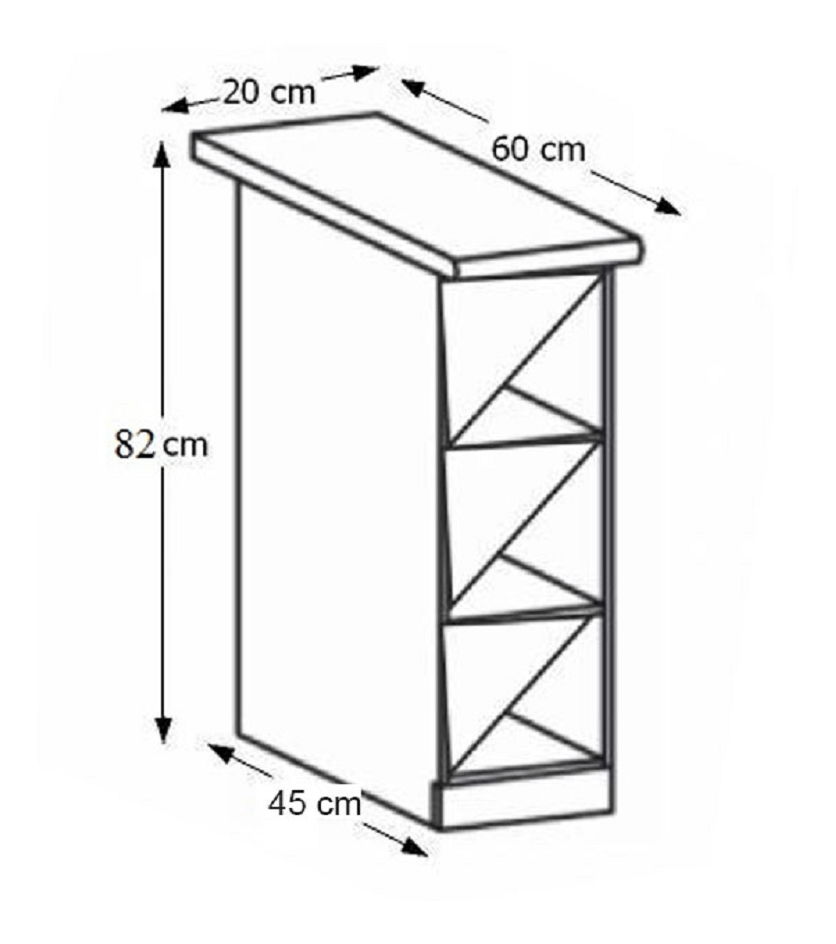 Dolní kuchyňská skříňka na láhve. Korpus je vyroben z kvalitní laminované dřevotřísky v barevném provedení sosna skandinávská s doplňkovým dekorem dubu divokého. Svislý úchyt. Korpus je bílé barvy a přední dvířka jsou krémové.