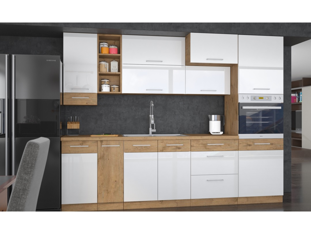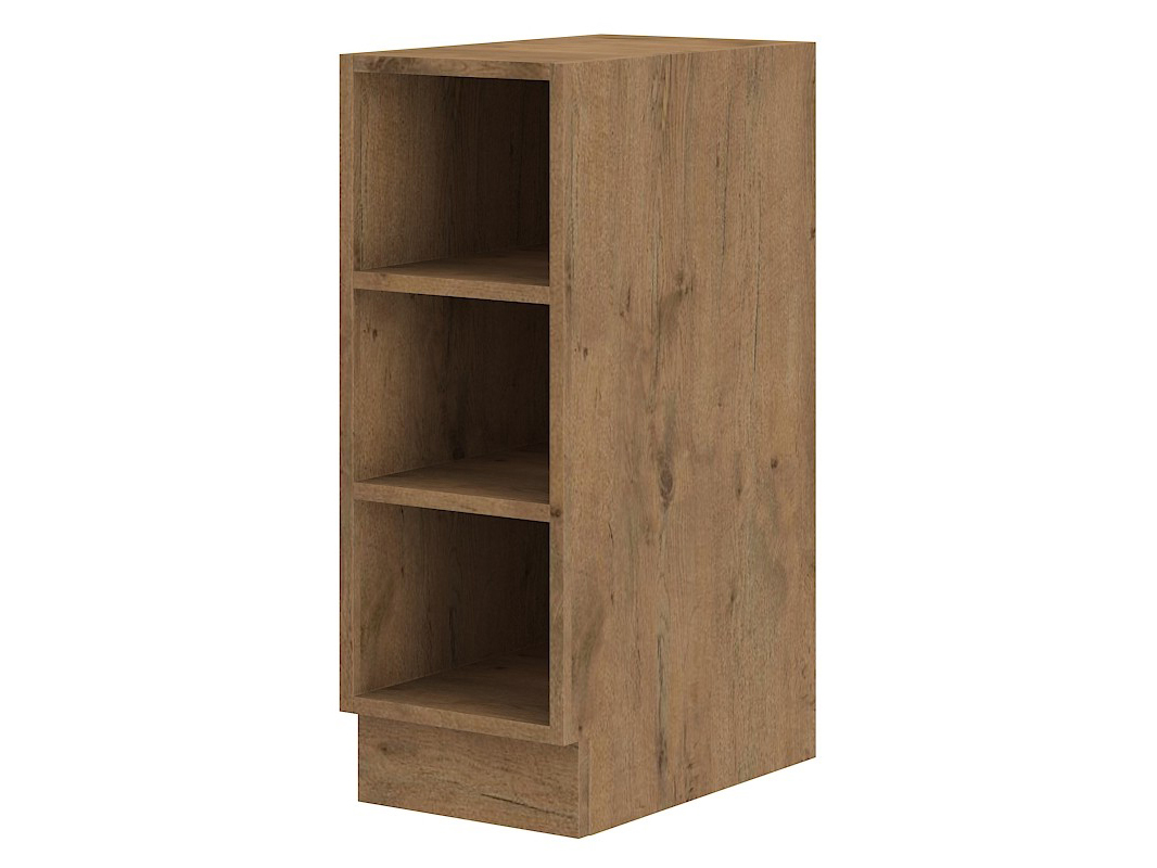 Dolní regál z kuchyňského sektorového systému v moderním style, má tři odkládací prostory. Skříňka je univerzální. Poslouží k odložení sklenic, dóz se surovinami, pepřen, případně do ní můžete zakomponovat nějaké dekorace, a tak kuchyni oživit.