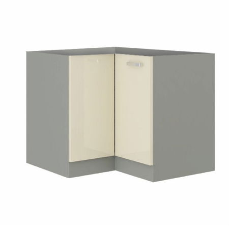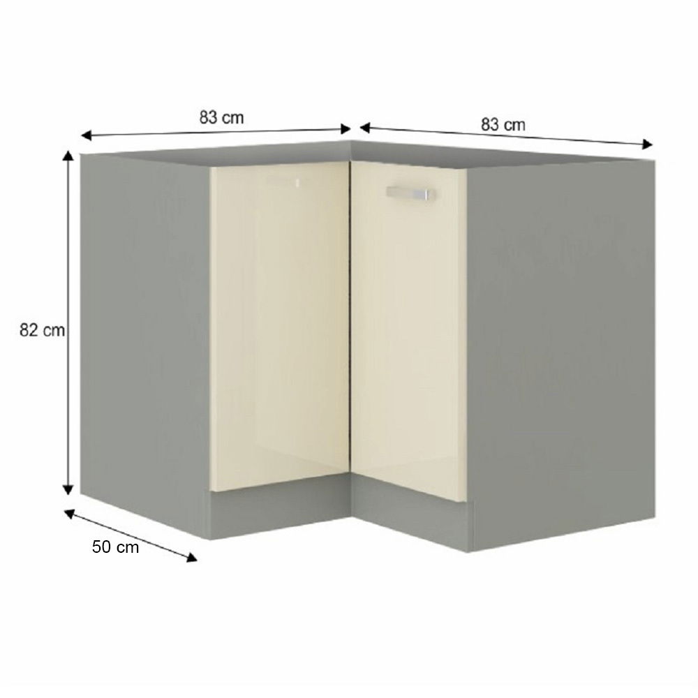 Luxusní dolní rohová kuchyňská skříňka Pleitton v béžové barvě o výšce 82 cm, šířce 83 cm a hloubce 50 cm je ideálním doplňkem pro vaši kuchyň. Materiál skříňky je DTD laminovaná a MDF, což zaručuje její kvalitu a odolnost. S výrobkem obdržíte 2 odkládací plochy a kovové úchyty. Systém tichého zavírání dvířek je samozřejmostí. Kuchyňská skříňka se dodává v demontu. Poznámka: Pracovní deska není součástí dodávky.