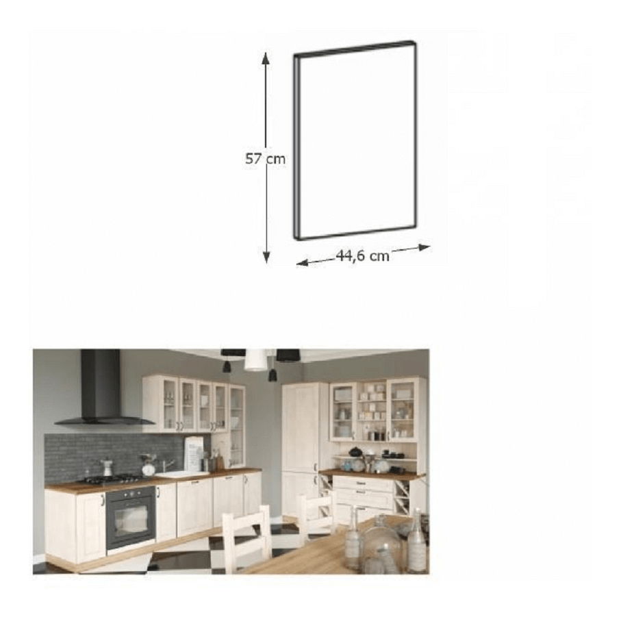 Dvířka na myčku Regnar mají výborné rozměry - výšku 57 cm a šířku 44,6 cm, jsou vyrobeny z kvalitní laminované dřevotřísky v barevném provedení sosna nordická. Materiál je vysoce odolný a má tloušťku 15 mm. Spodní skříňky jsou součástí kuchyňského systému v provensálském stylu a jsou dodávány bez pracovní desky a bez soklu. Pro každou dolní skříňku (kromě rohových skříněk) je třeba doobjednat i sokl v provedení dub divoký v ceně a 2 kusy úchytů na sokl.