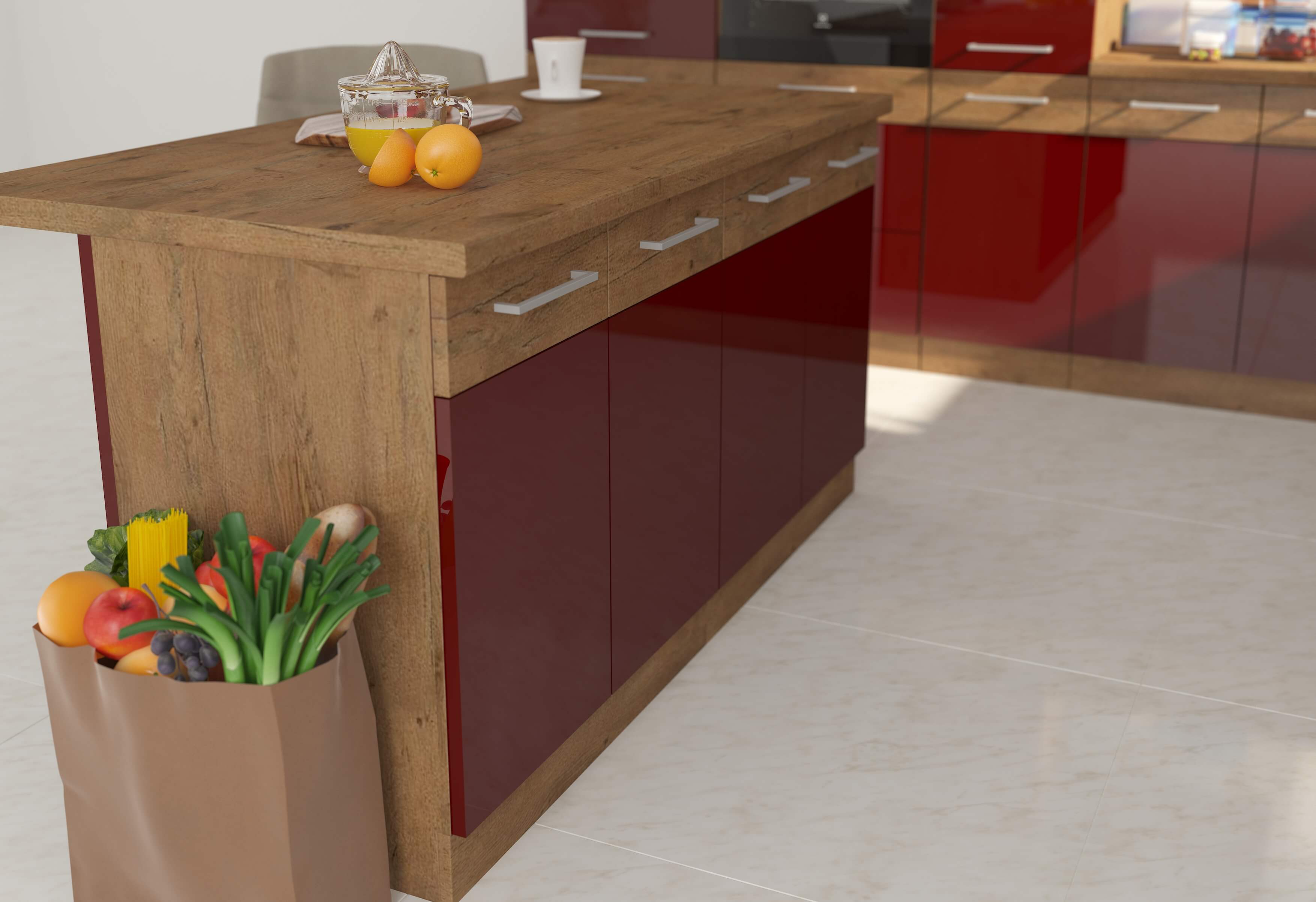 Staňte se pro tuto chvíli architektem a designér vlastní kuchyně. Nabízíme Vám směs designových skříněk v barvě bílá, šedá a bordó v kombinaci dubu Lancelot. Přáli jste si mít troubu v úrovni učí, nebo ji máte rádi v dole. Přáli jste si skříňky s výklopnými dvířky nebo klasicky doprava či doleva. Výběr je na vás a na vaší fantazii.