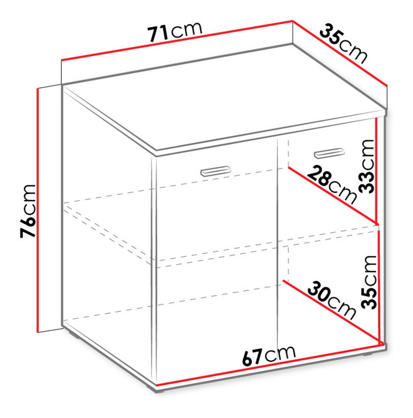 16 mm silná laminovaná deska, okraj: melamin, rukojeti a nohy vyrobené z plastu, standardní panty, komoda vybavená montážními prvky na zeď