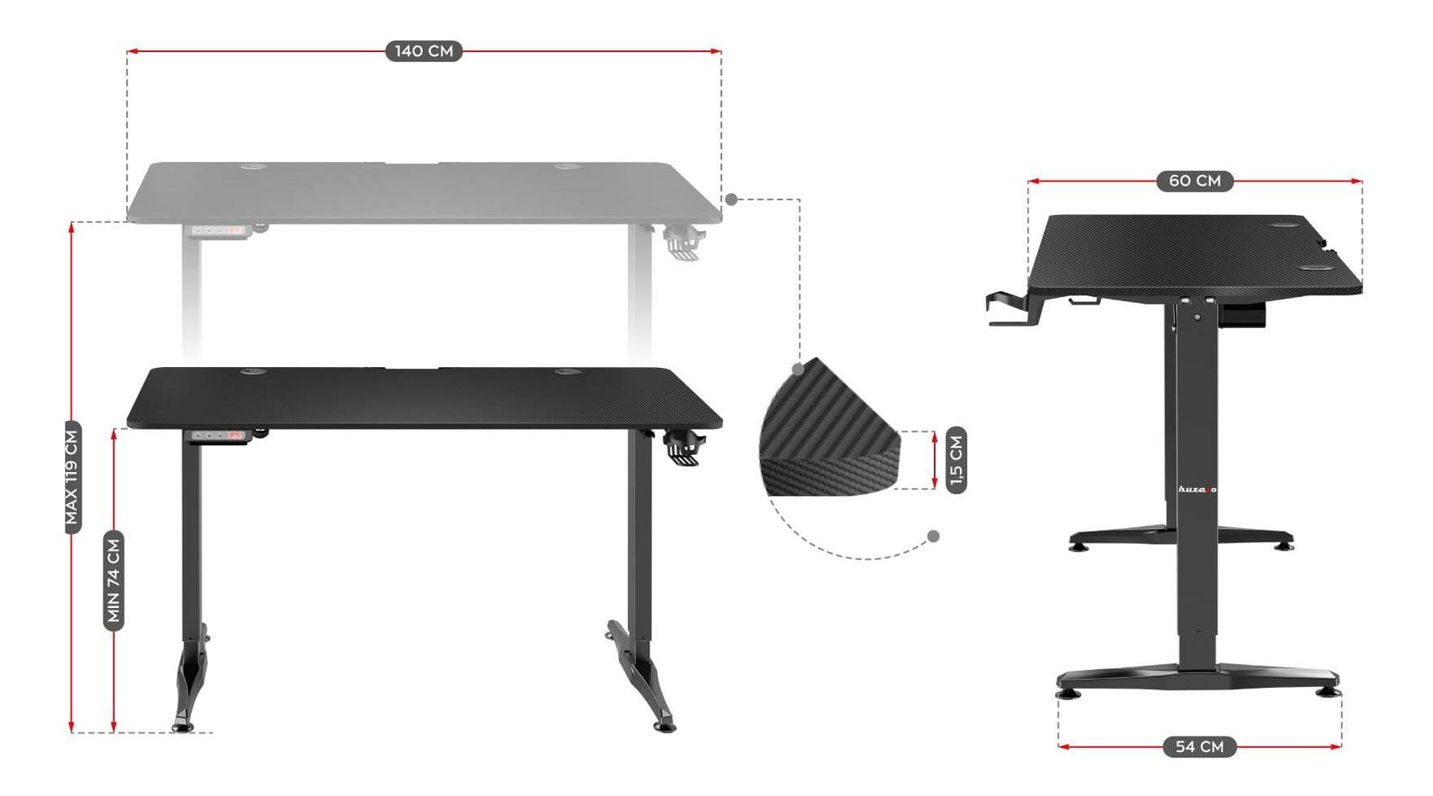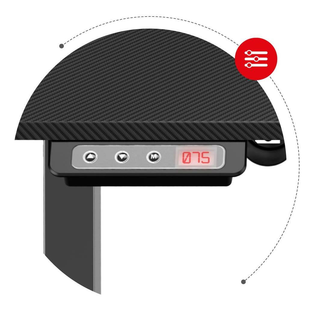 ZobrazitDlouhé hraní, dlouhé učení nebo práce na plný úvazek – každá z těchto činností je pohodlnější, když je náš prostor ergonomický a změna polohy vyžaduje jen jedno tlačítko. Stůl je vybaven moderním ovládacím panelem s modulem připomenutí změny pracovní polohy u stolu. Vyberte si 1 ze 3 možností (30 minut, 45 minut nebo 60 minut) a stůl vám připomene, abyste v zájmu svého zdraví změnili polohu u stolu na stání nebo sezení. Díky možnosti paměti se můžete jednoduše vrátit k dříve nakonfigurovaným oblíbeným nastavením pracovního stolu – pro polohy v sedě a ve stoje. Panel je umístěn na ergonomickém místě, vždy přístupný. LED displej zobrazuje aktuální výšku stolu s přesností na 1 cm. Prvotřídní motor zajišťuje plynulý pohyb i při zatížené desce stolu (celková hmotnost až 80 kg). Precizní pohyb zajišťuje pohodlné používání a tichý chod pohonu vás neruší za žádných podmínek. Deska stolu je pokryta speciálním povlakem podobným uhlíku. Jedná se o mimořádně praktické řešení, stolová deska je odolná, odolná vůči poškrábání a nečistotám a zároveň skvěle vypadá. Stolová deska o tloušťce 15 mm, vyrobená z odolné MDF desky, zajišťuje odolnost a stabilitu i při velmi vysokém tlaku. Stůl má dva vstupy pro uspořádání kabelů. Vstupy jsou namontovány na obou stranách stolu. Speciální, pohodlný držák na nápoje. Snadno a bezpečně do ní uložíte plechovky, láhve a sklenice. Toto řešení zabrání zaplavení zařízení. Pohodlný, praktický držák na sluchátka. Když sluchátka nepoužíváte, visí bezpečně, aniž by zabírala místo na pracovní desce. Držák lze rychle a pohodlně skrýt pod pracovní stůl.