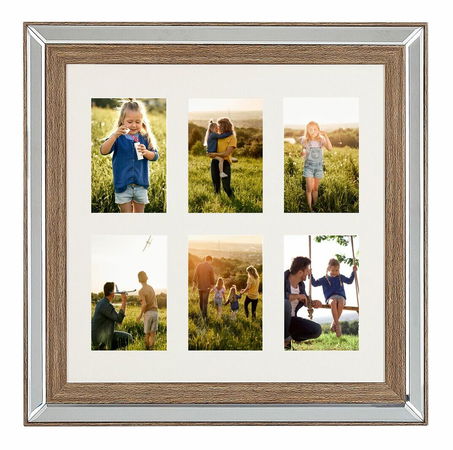 Všichni máme doma spoustu fotografií, které bychom si chtěli pověsit na zeď v obýváku, ložnici nebo předsíni. S tímto rámem, do kterého za vejde až šest fotografií, si ušetříte námahu s věšením každého jednoho rámu zvlášť. Je vyroben ze snadno udržovatelného syntetického materiálu v tmavém dřevěném provedení se stříbrnými detaily. Světlá pasparta zvýrazní barvu a oddělí každou fotografii.